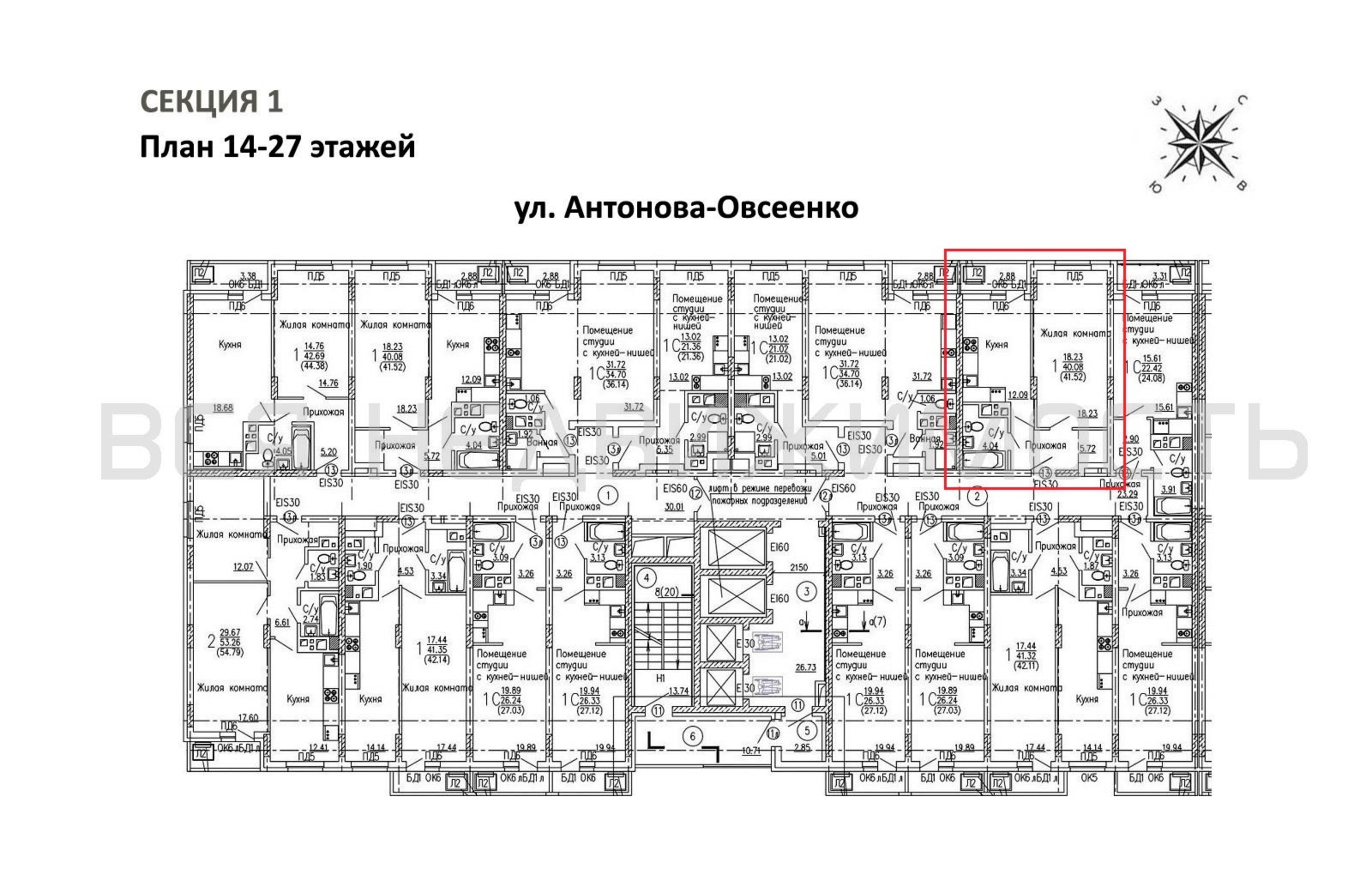 1-комнатная квартира, 41.52 м² 15/27 этаж ID объекта 100056440