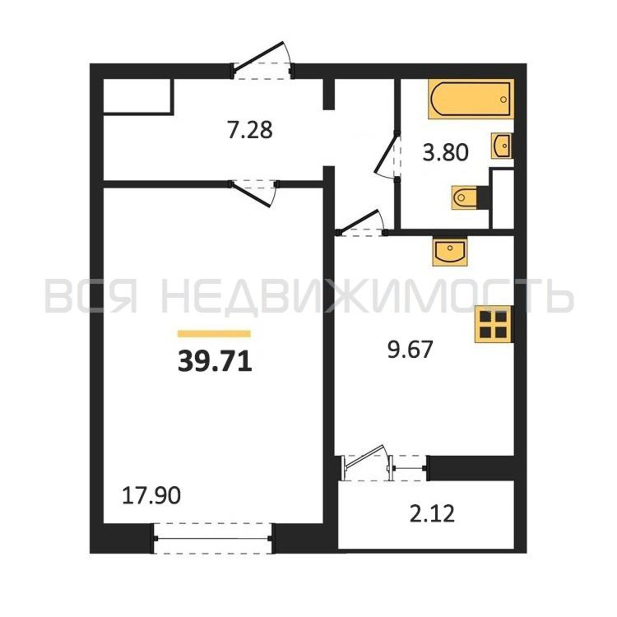 1-комнатная квартира, 39.71 м² 14/15 этаж ID объекта 100058221