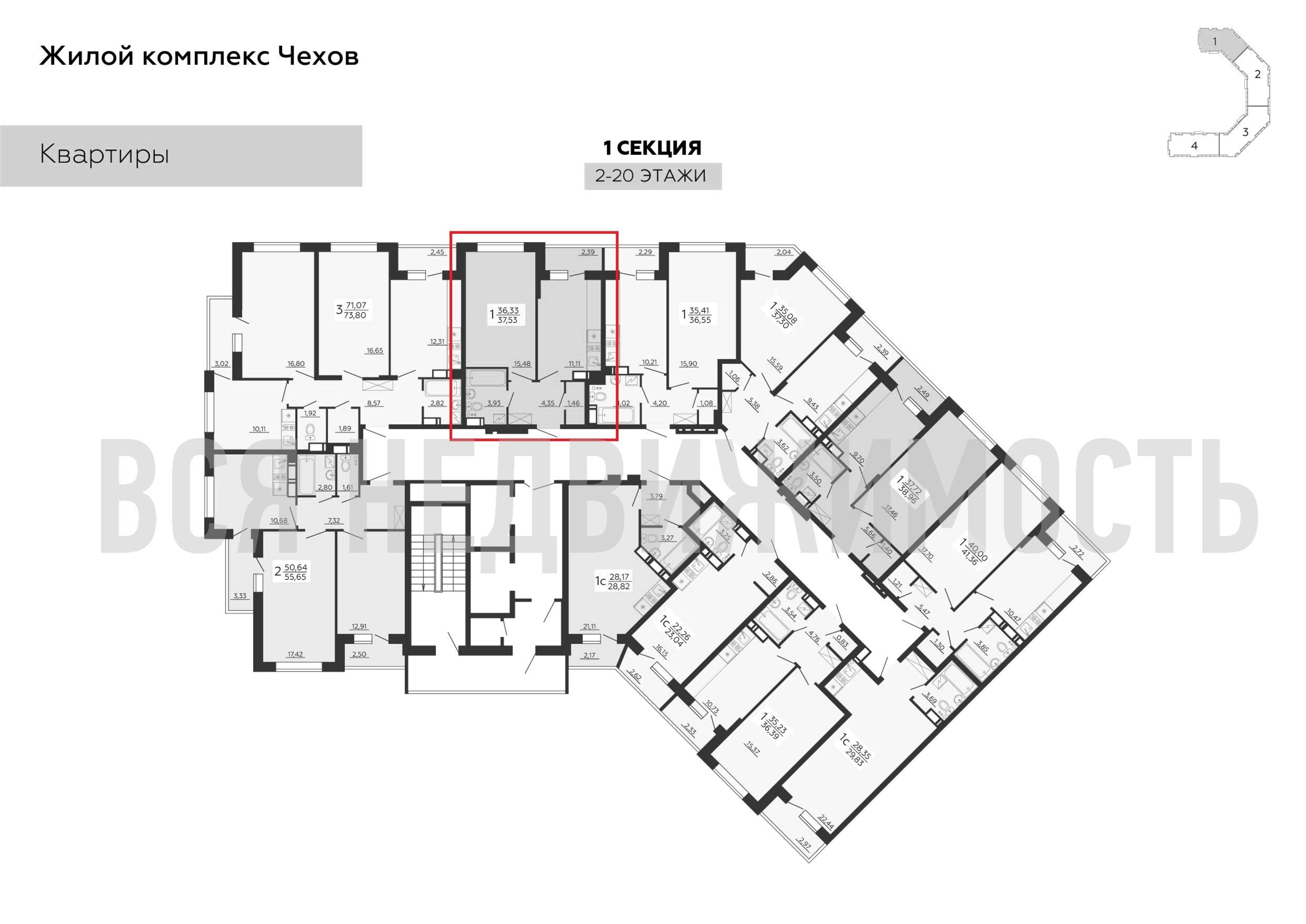 1-комнатная квартира, 37.53 м² 16/20 этаж ID объекта 100064798