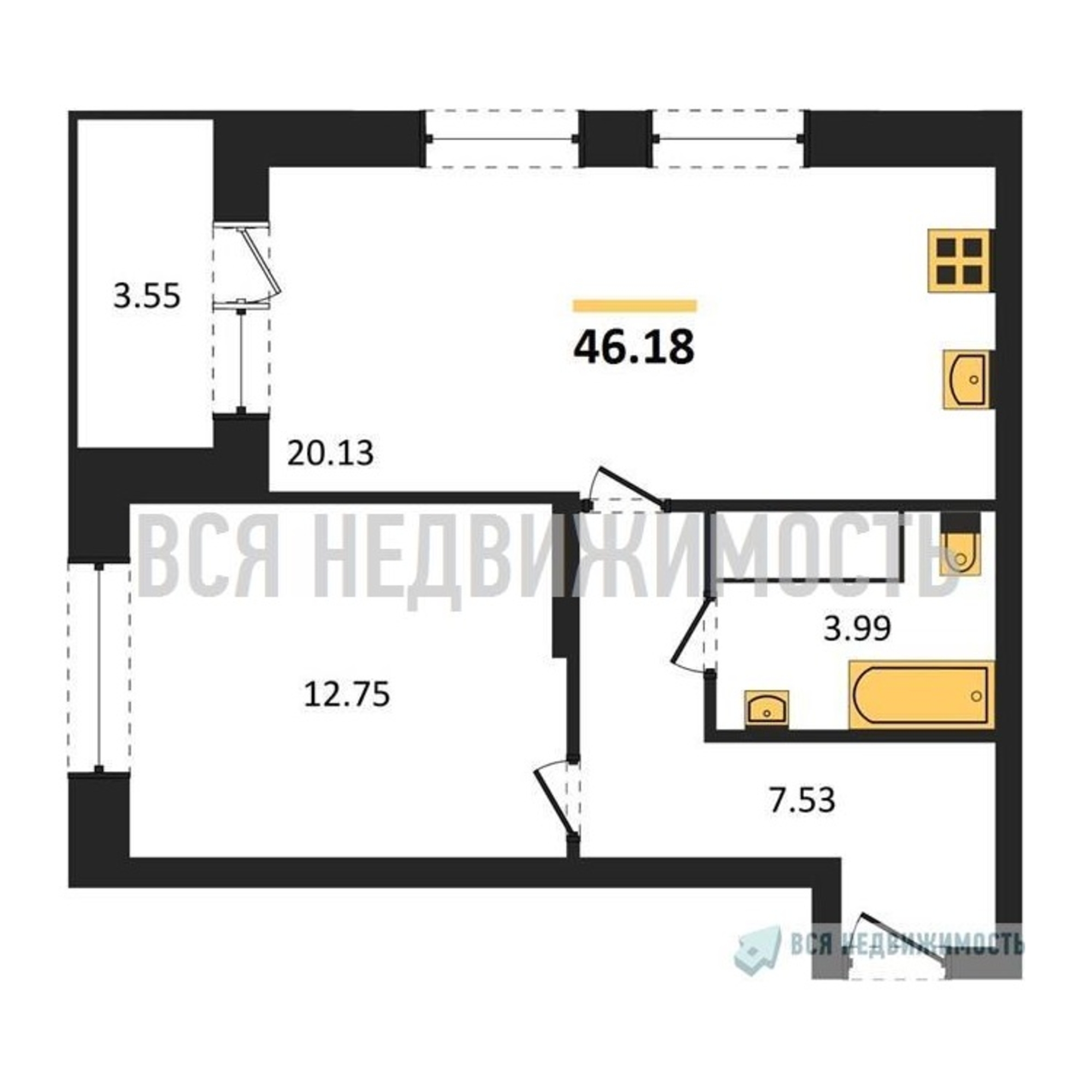 1-комнатная квартира, 46.18 м² 23/25 этаж ID объекта 100070113