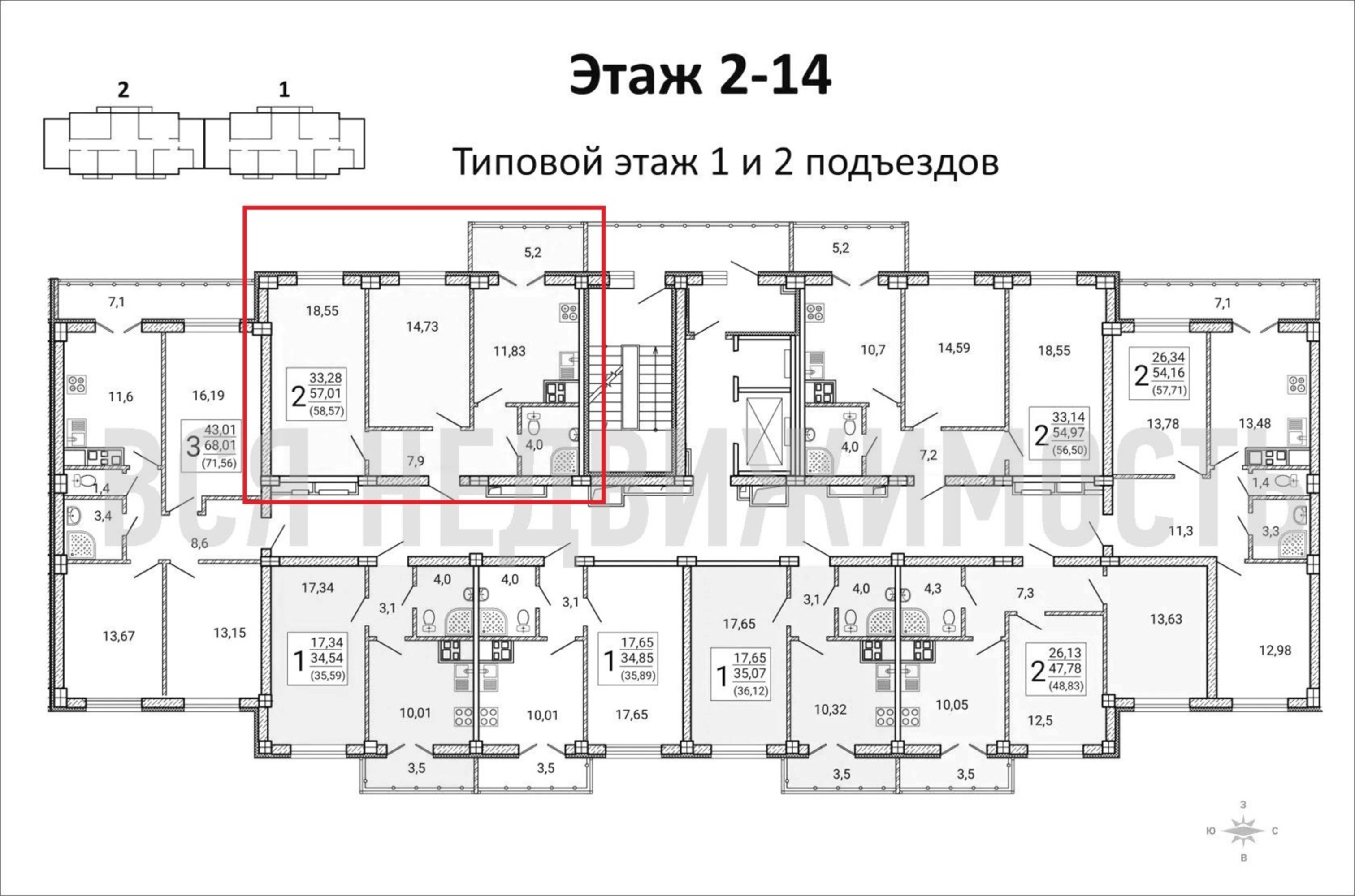 2-комнатная квартира, 58.57 м² 7/15 этаж ID объекта 100070833