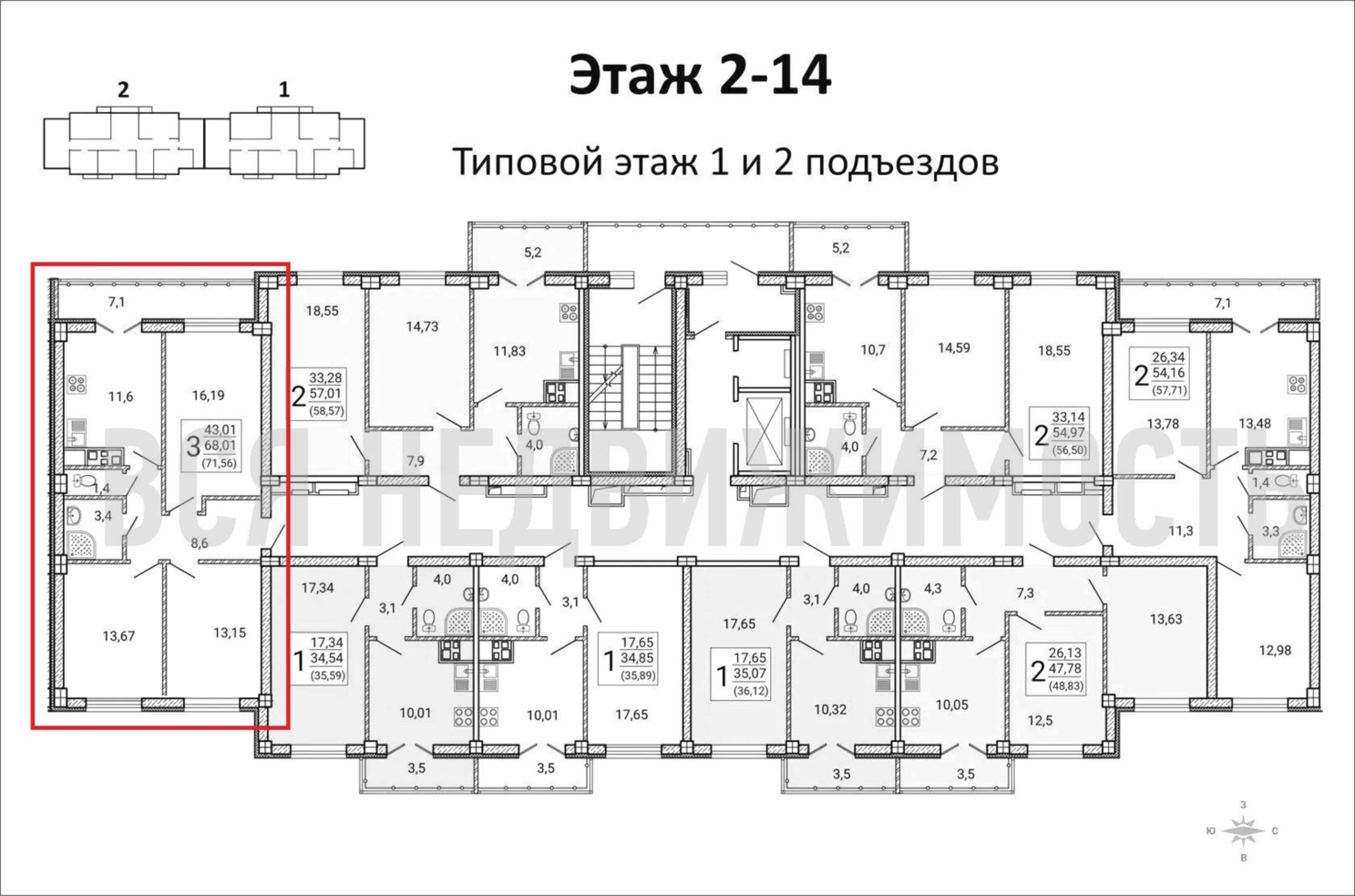 3-комнатная квартира, 71.56 м² 11/15 этаж ID объекта 100070857