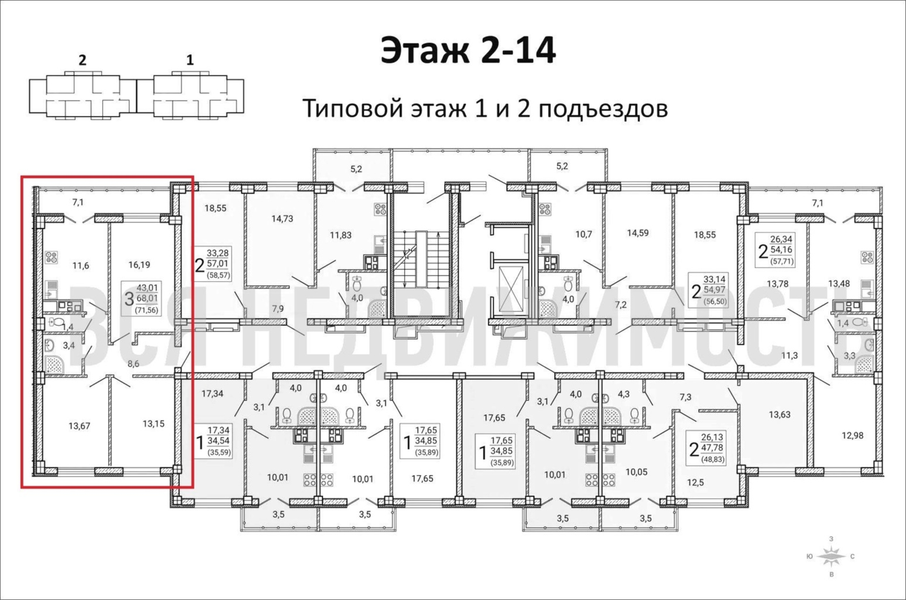 3-комнатная квартира, 71.56 м² 5/15 этаж ID объекта 100070911