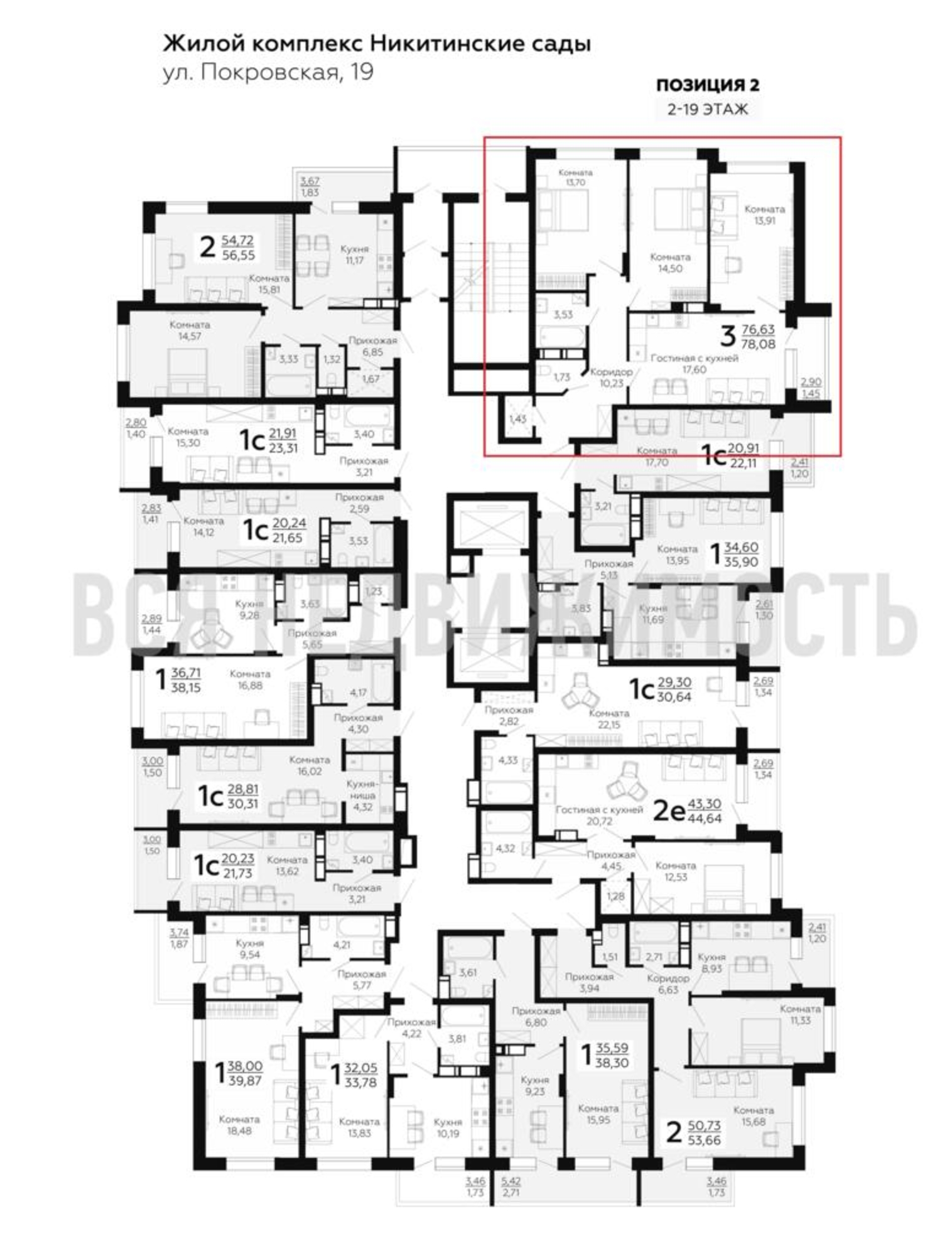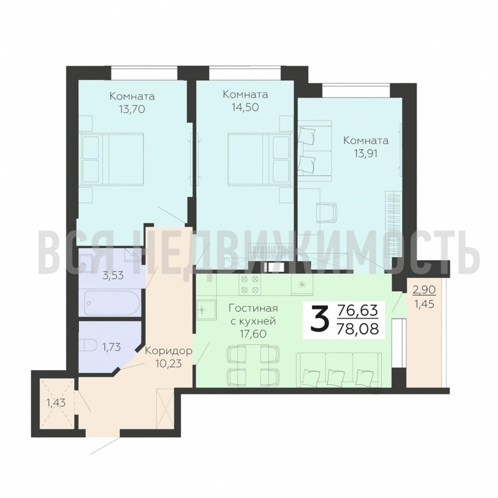 3-комнатная квартира, 78.08 м² 18/19 этаж ID объекта 100071444