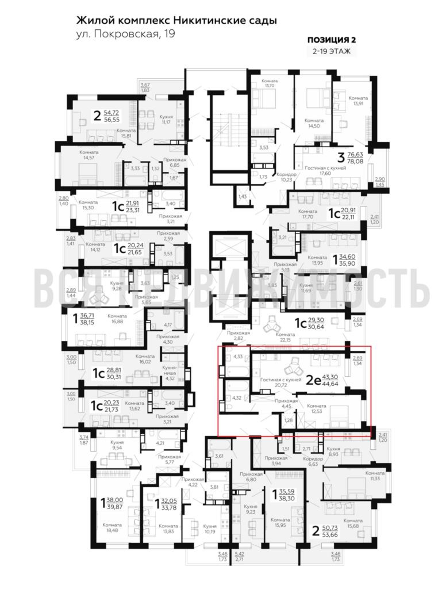 1-комнатная квартира, 44.64 м² 18/19 этаж ID объекта 100071448