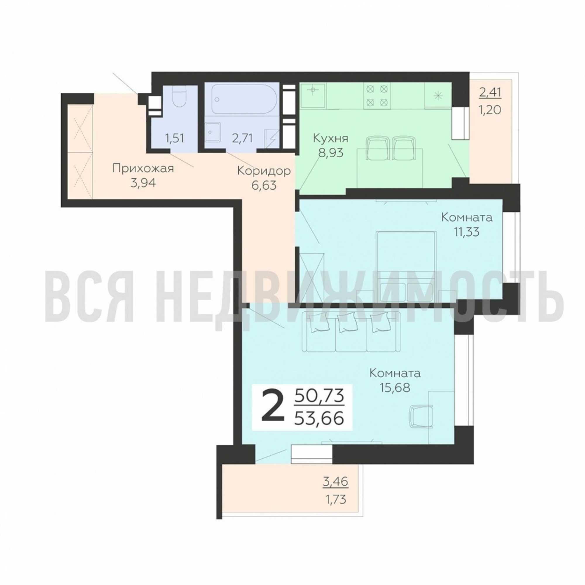 2-комнатная квартира, 53.66 м² 19/19 этаж ID объекта 100071464