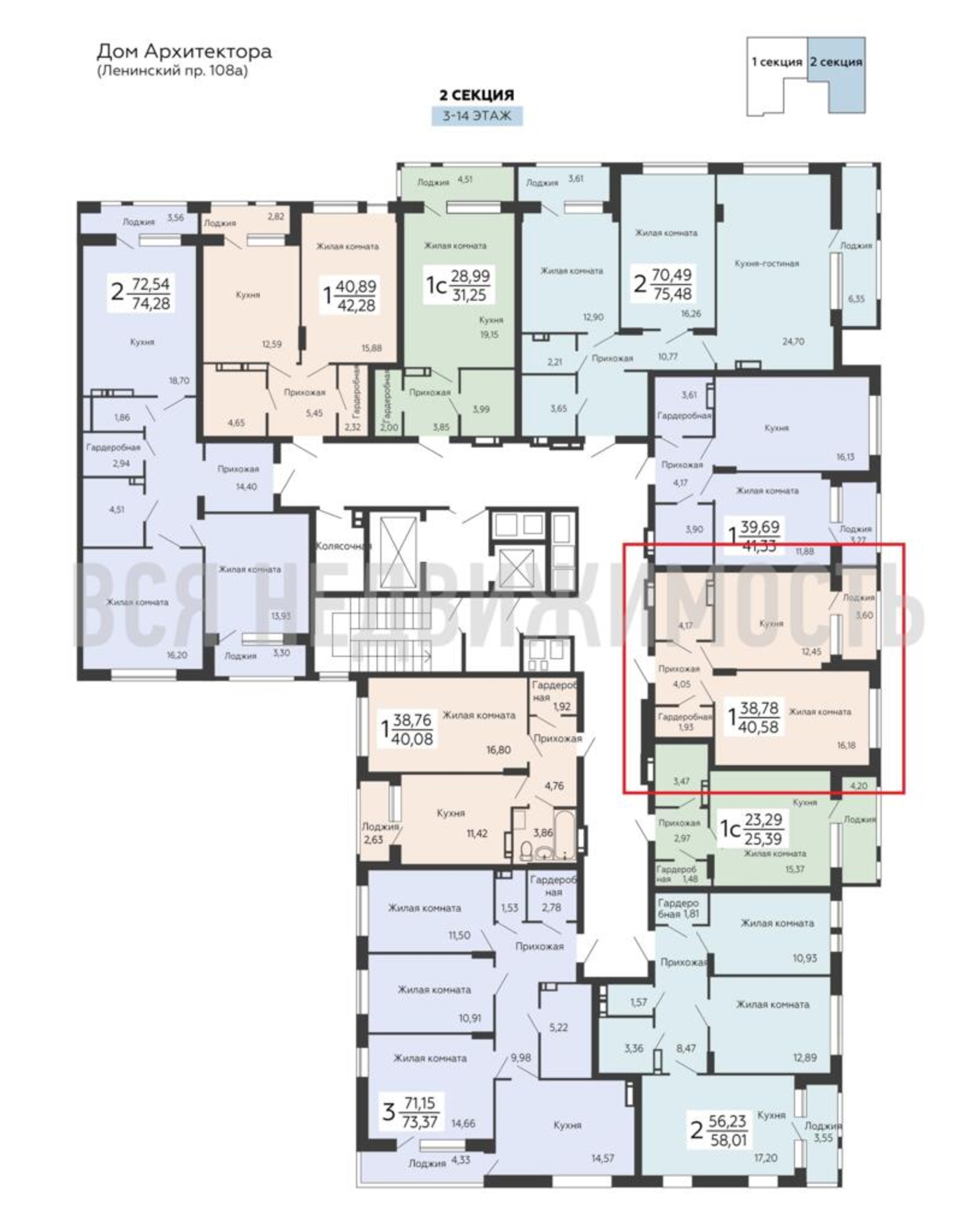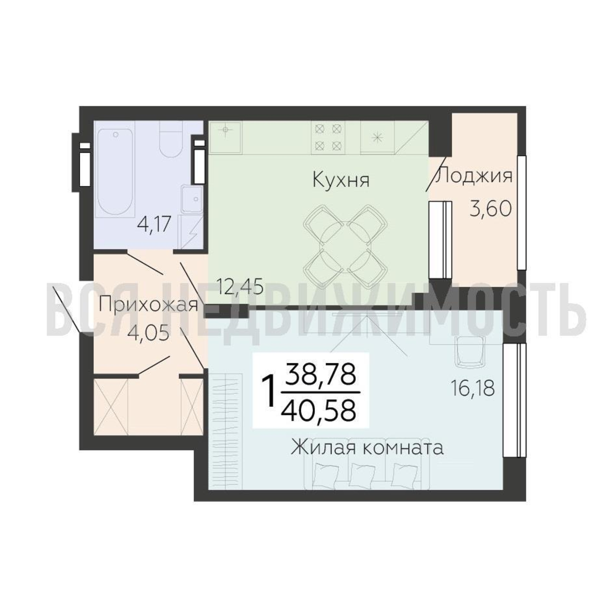 1-комнатная квартира, 40.58 м² 14/14 этаж ID объекта 100071489