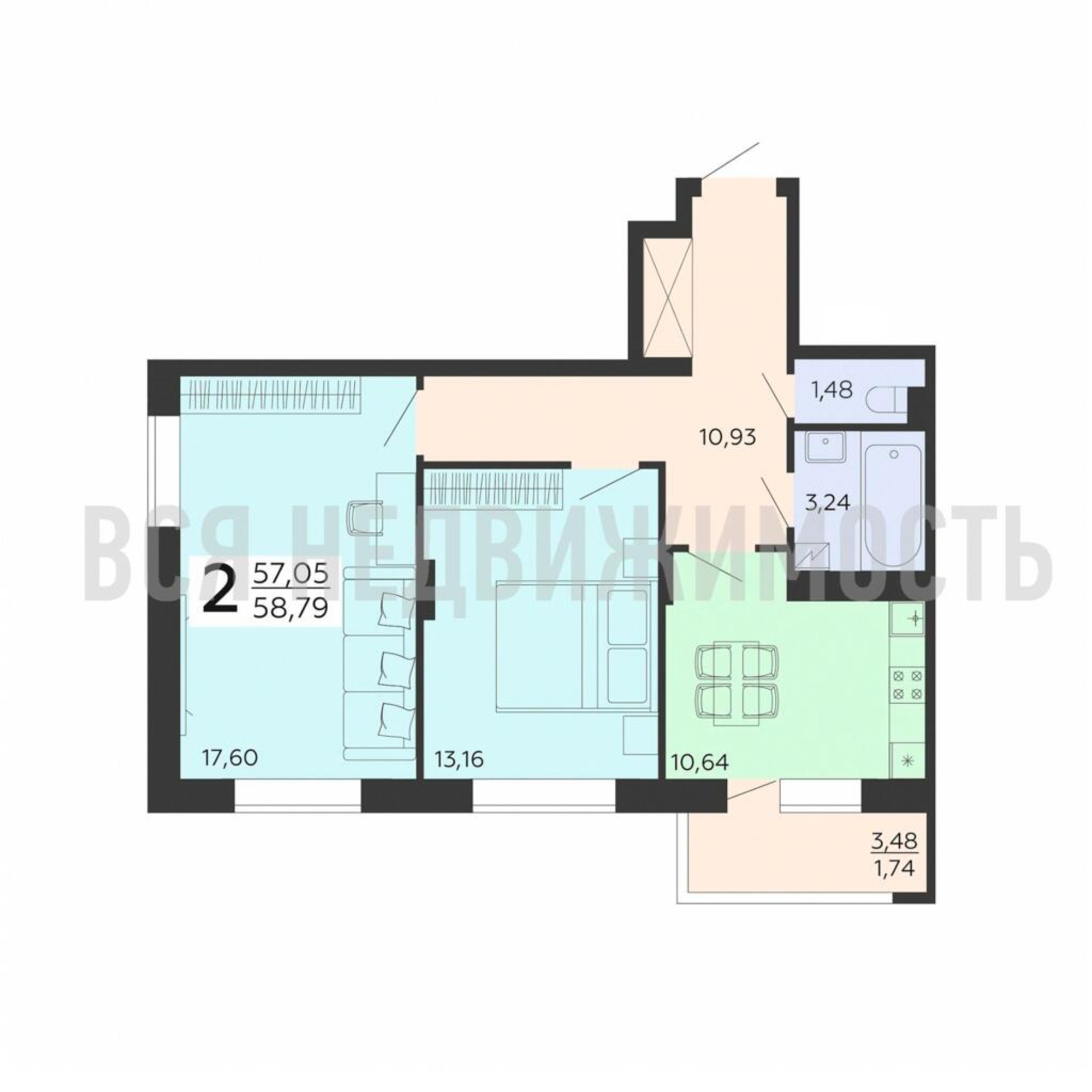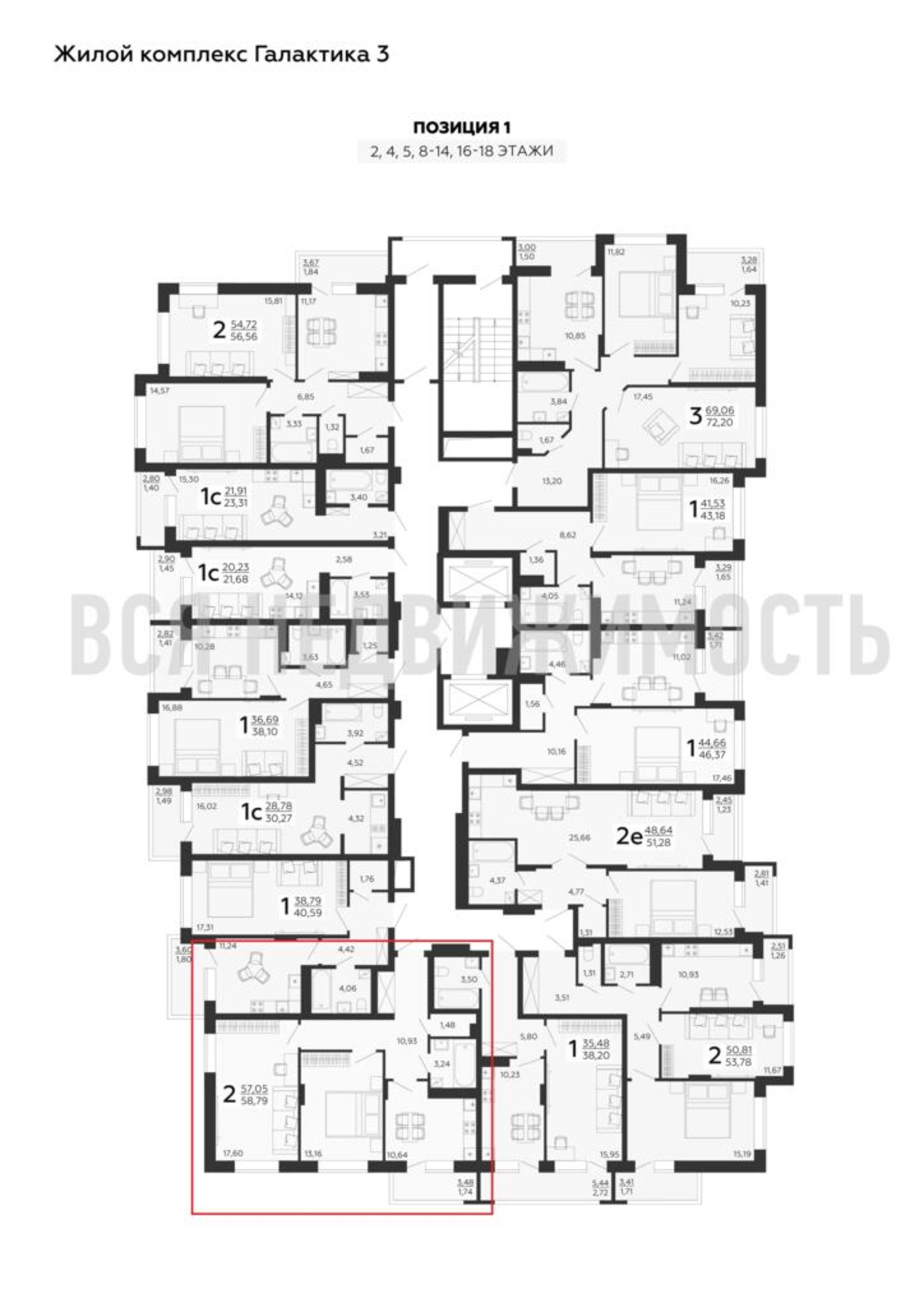 2-комнатная квартира, 58.79 м² 16/18 этаж ID объекта 100072890