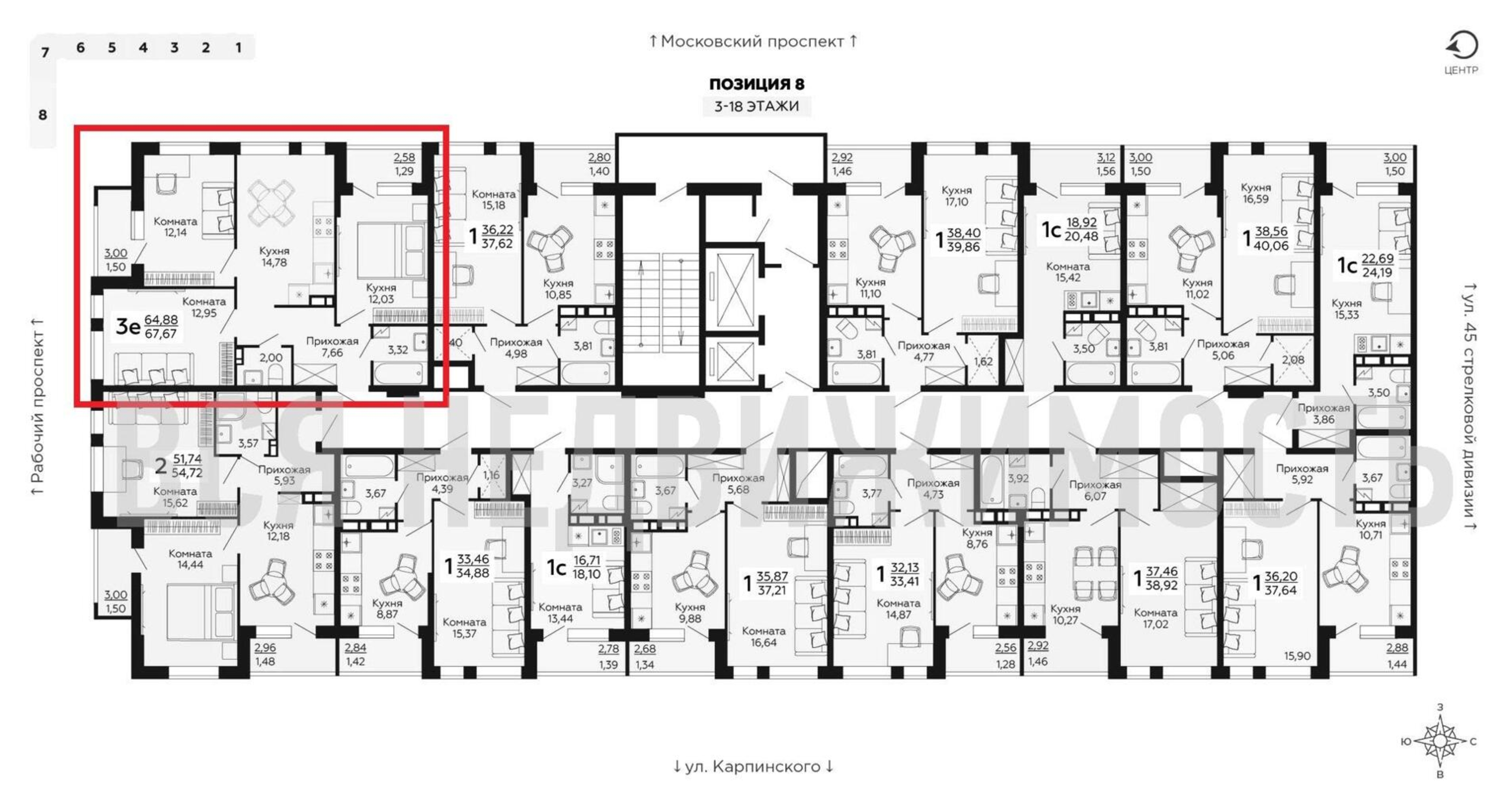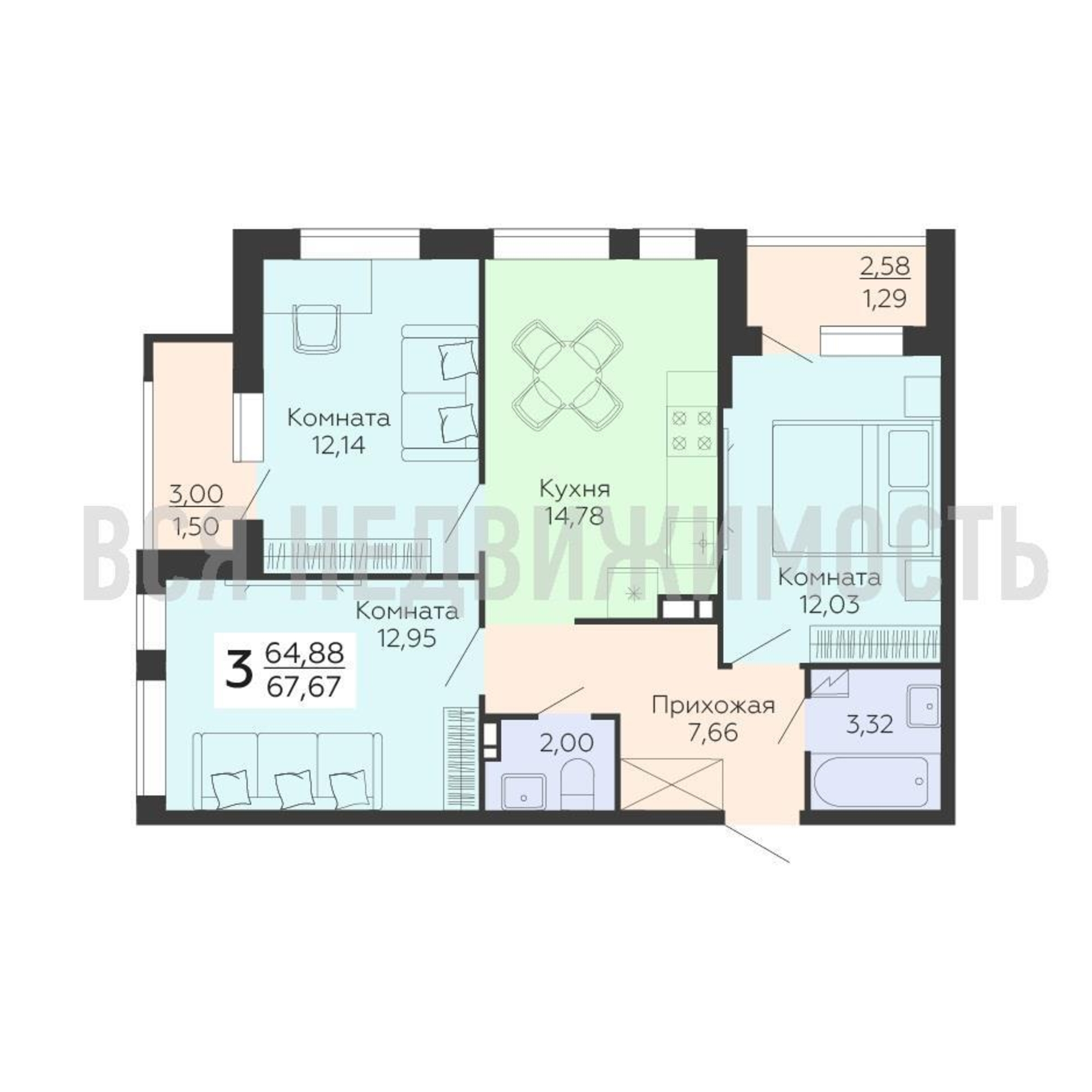 3-комнатная квартира, 67.67 м² 9/18 этаж ID объекта 100073513
