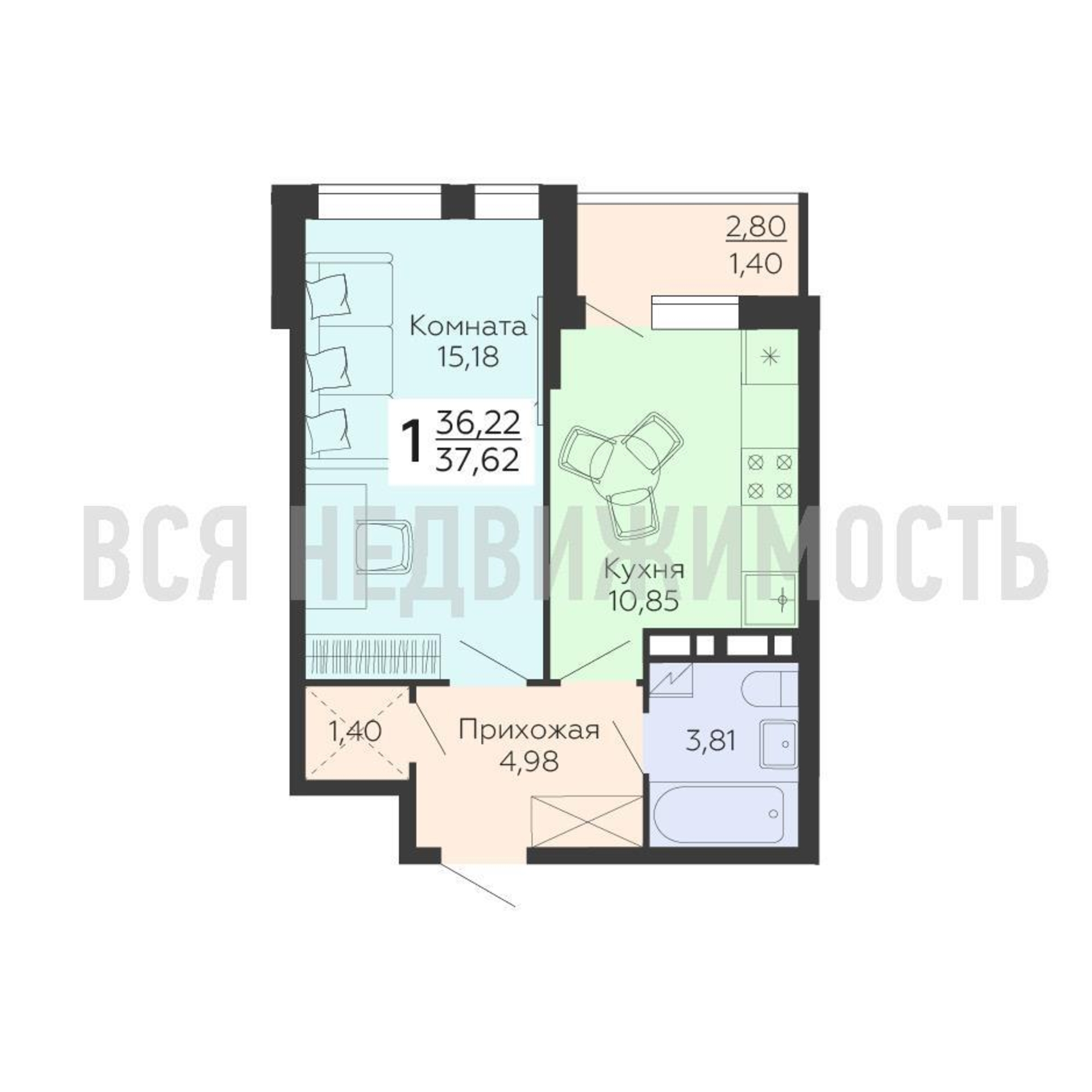 1-комнатная квартира, 37.62 м² 13/18 этаж ID объекта 100073566