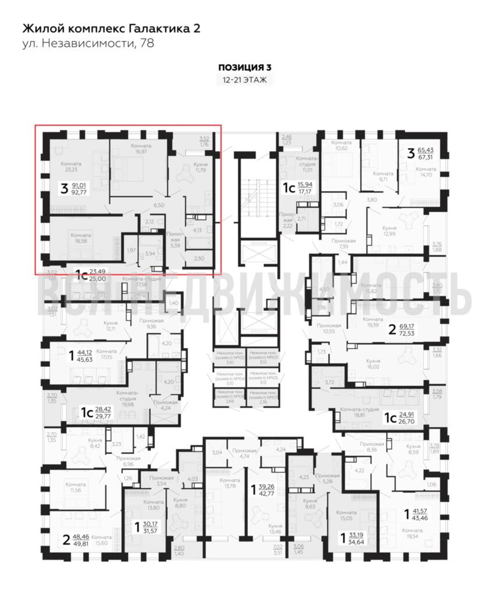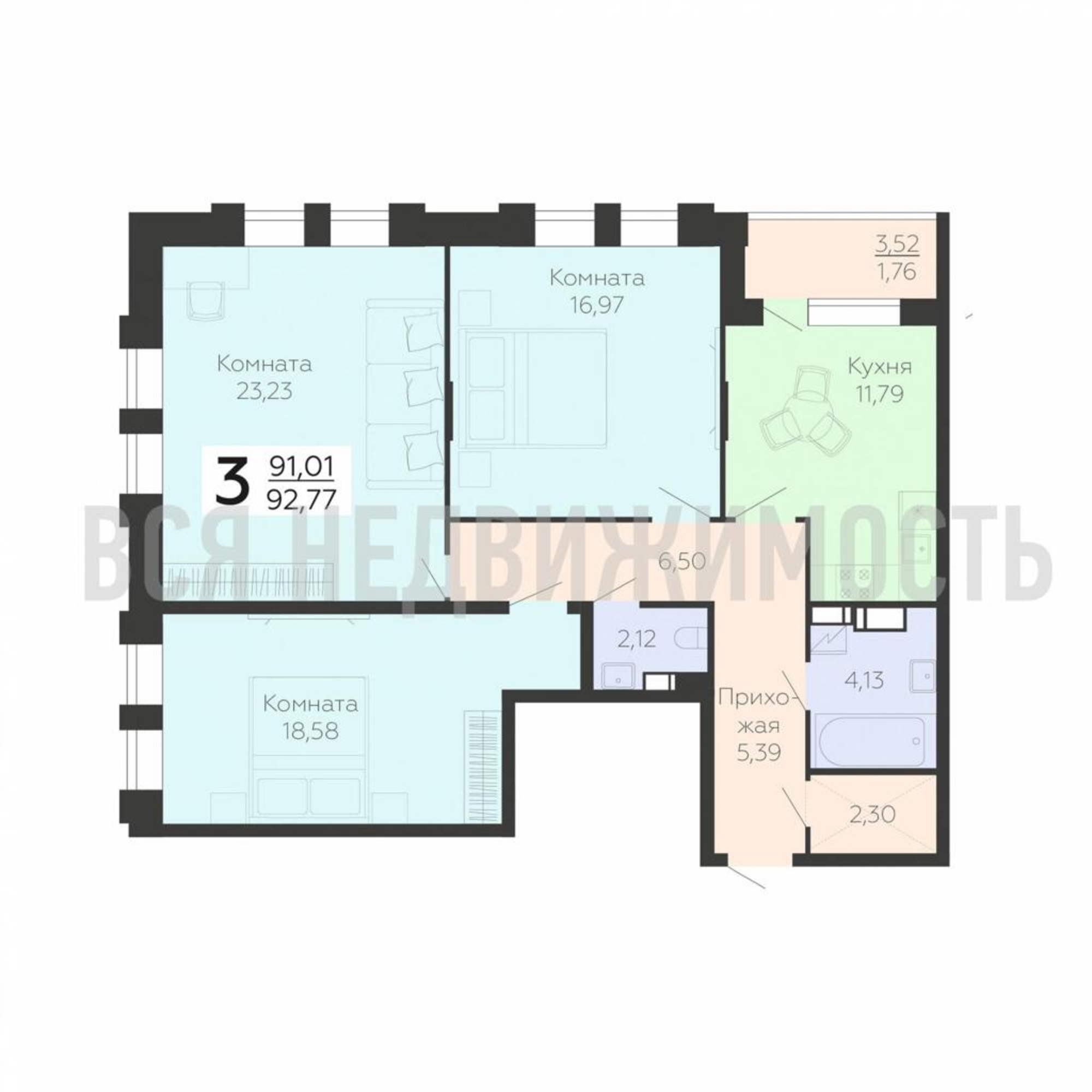 3-комнатная квартира, 92.77 м² 18/21 этаж ID объекта 100074620