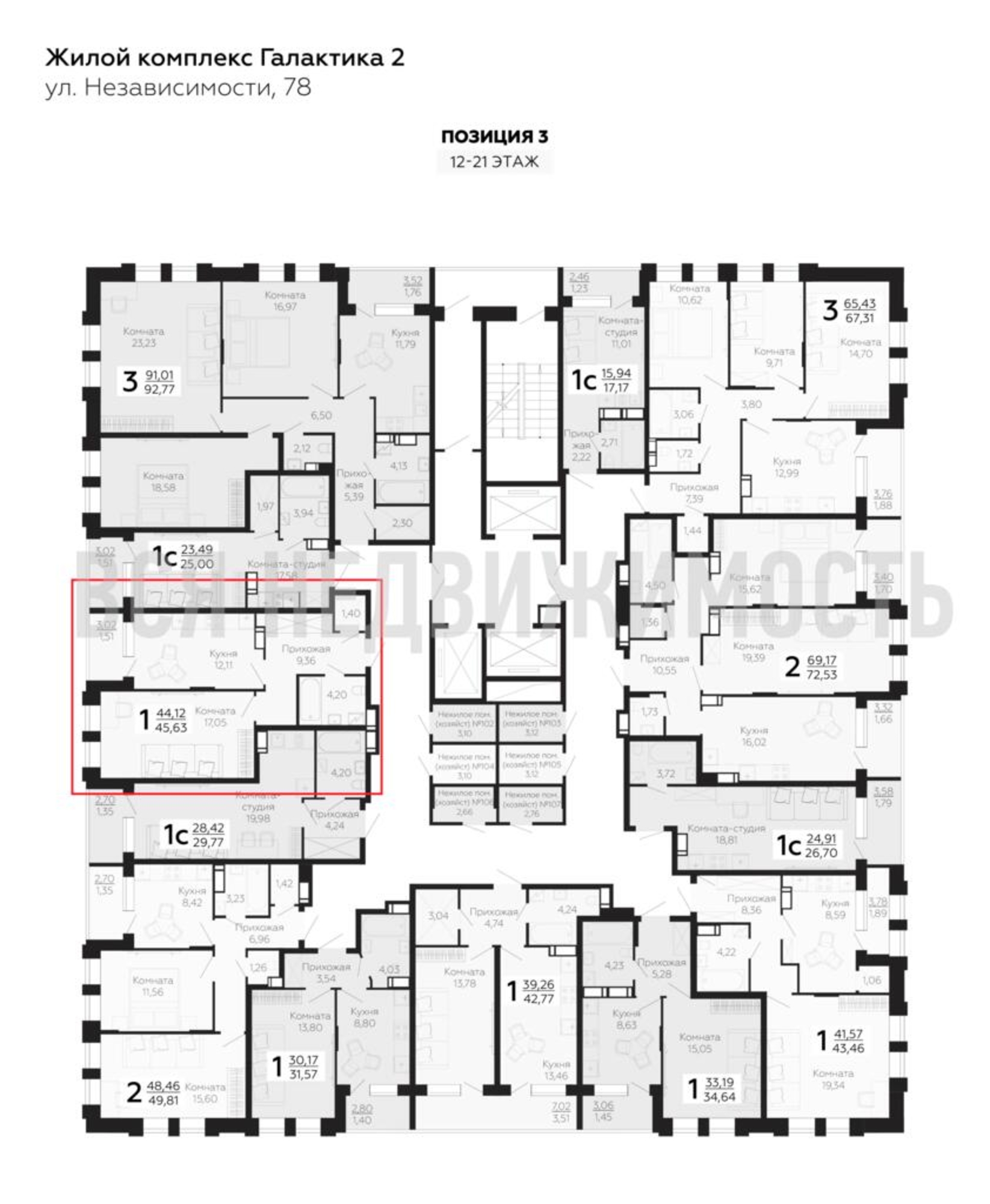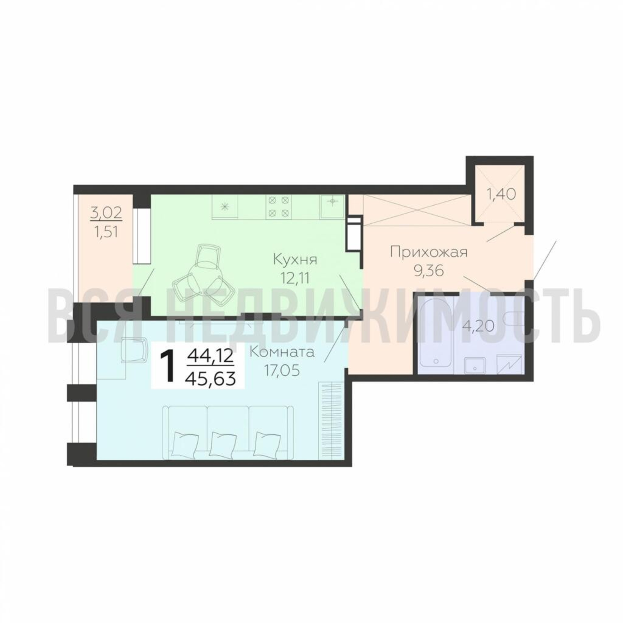 1-комнатная квартира, 45.63 м² 20/21 этаж ID объекта 100074644