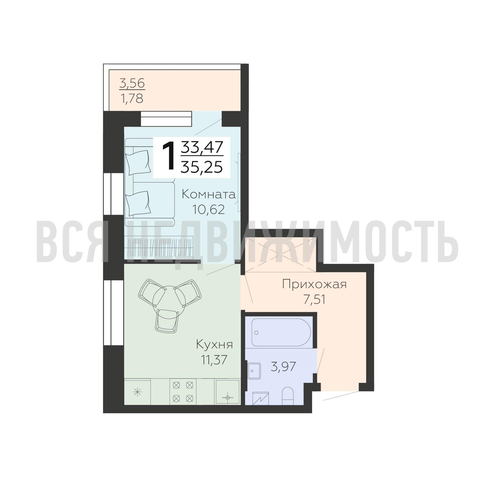1-комнатная квартира, 35.25 м² 4/24 этаж ID объекта 100075151