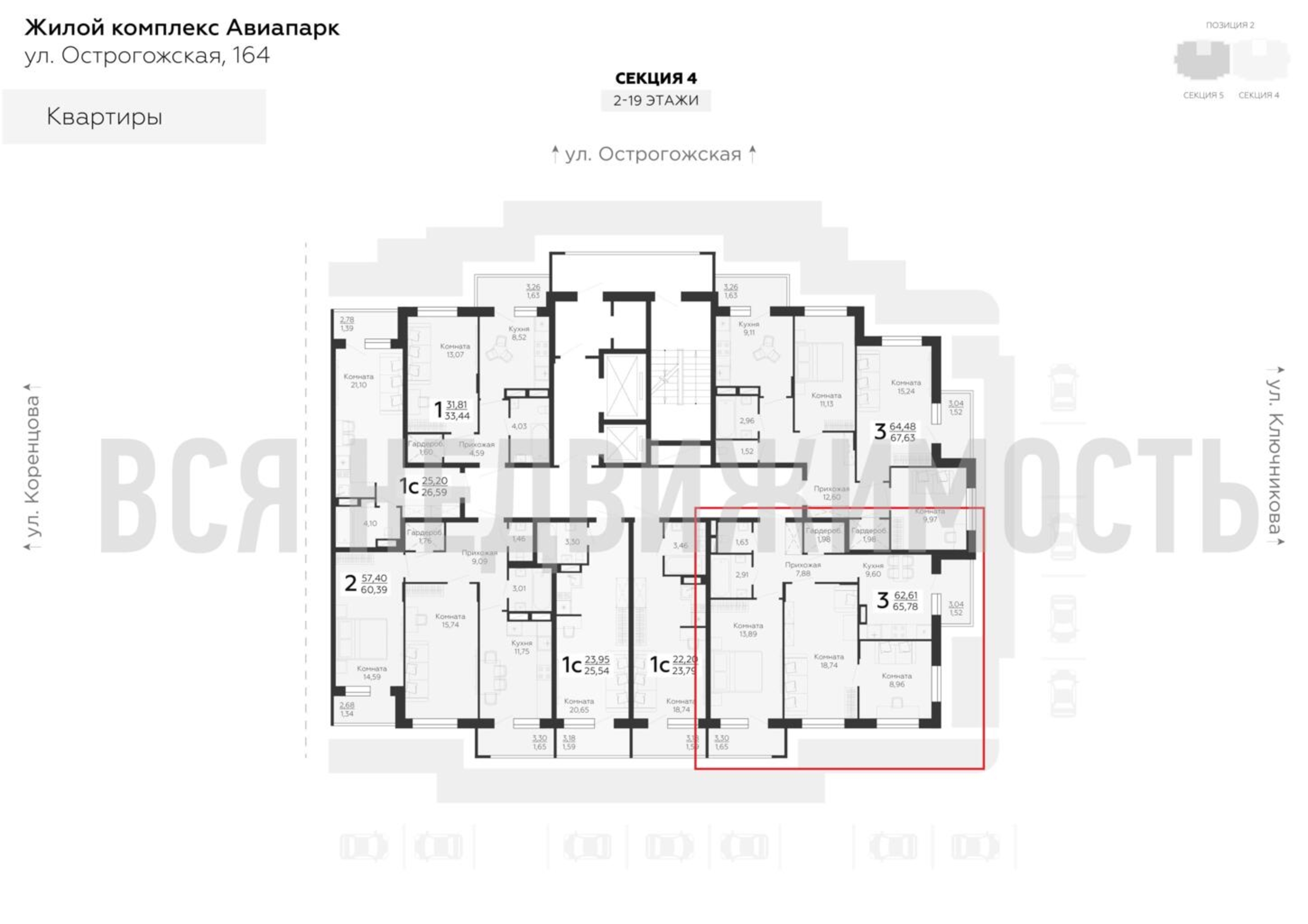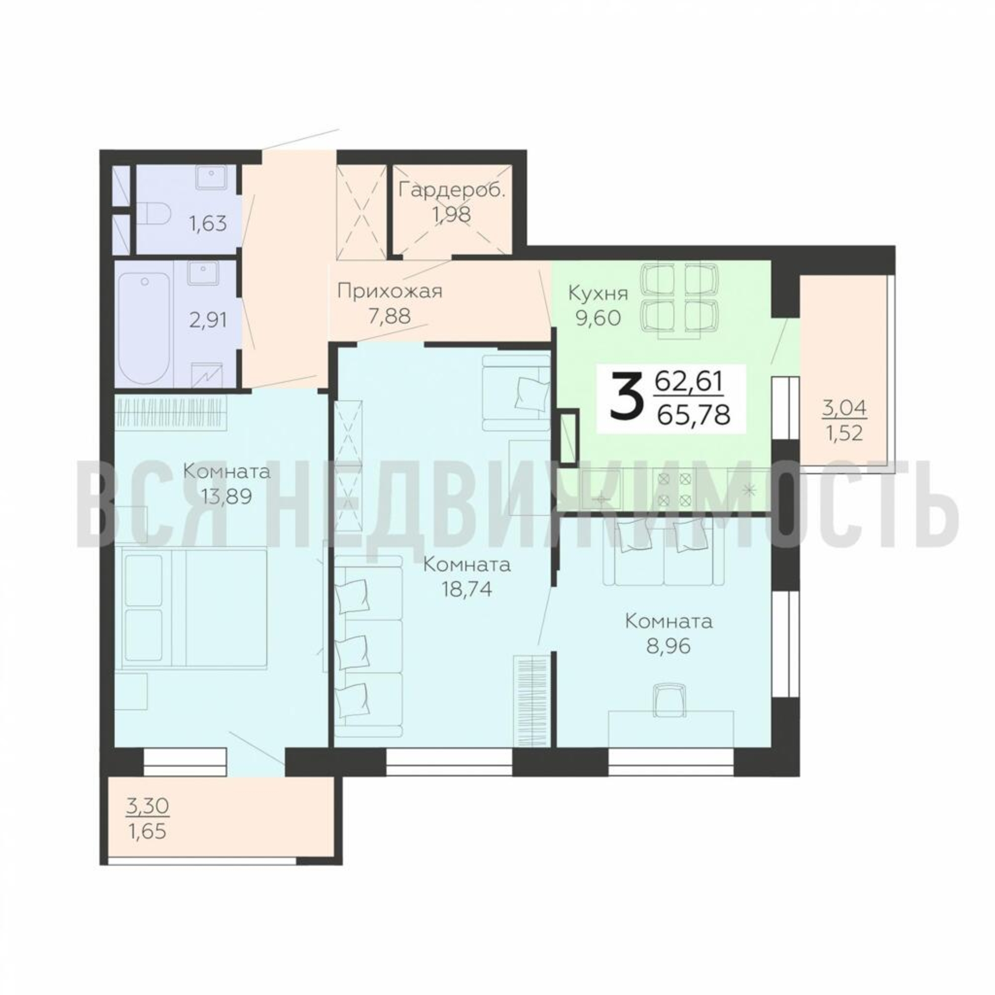 3-комнатная квартира, 65.78 м² 12/19 этаж ID объекта 100075377