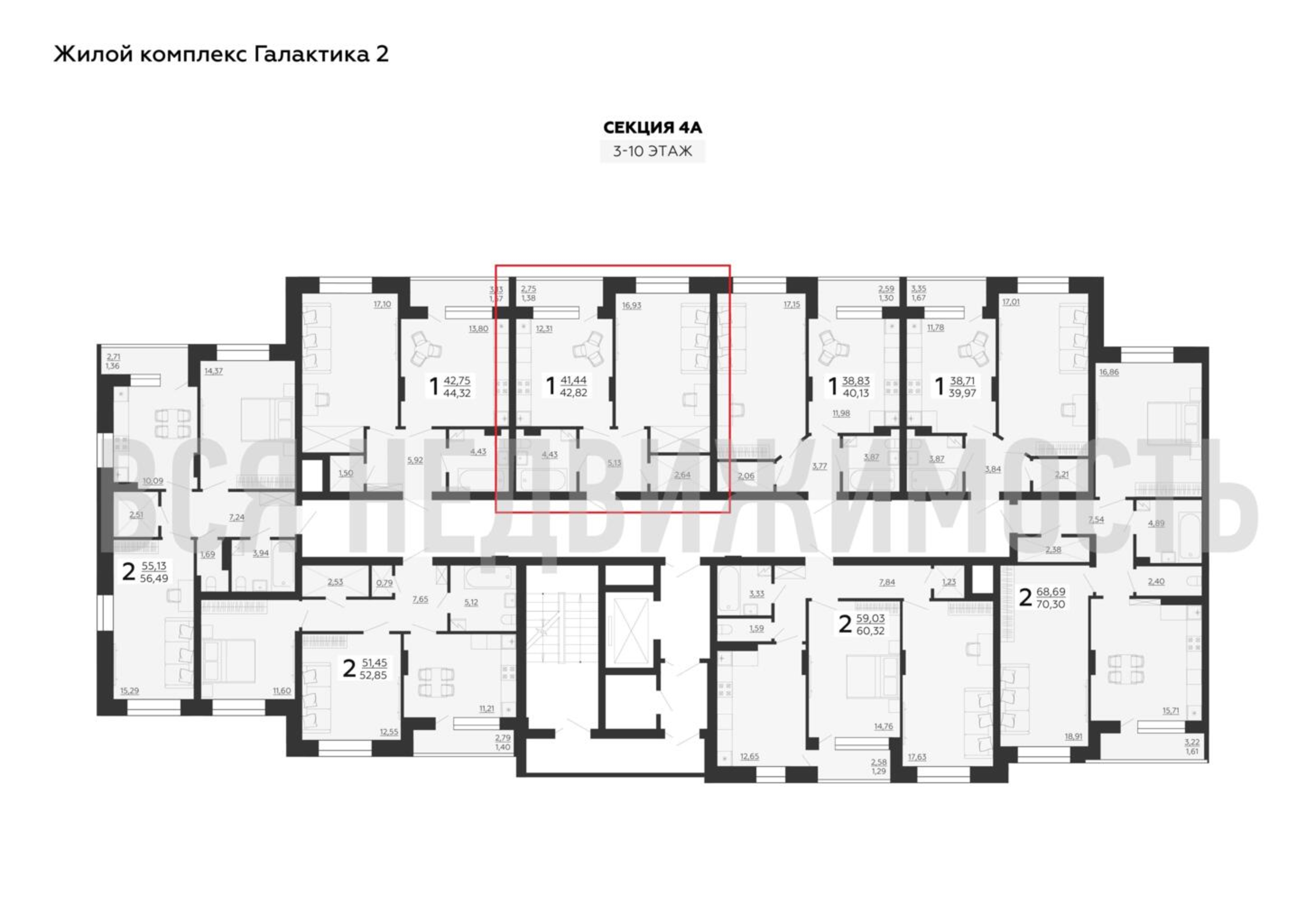 1-комнатная квартира, 42.82 м² 10/10 этаж ID объекта 100075747