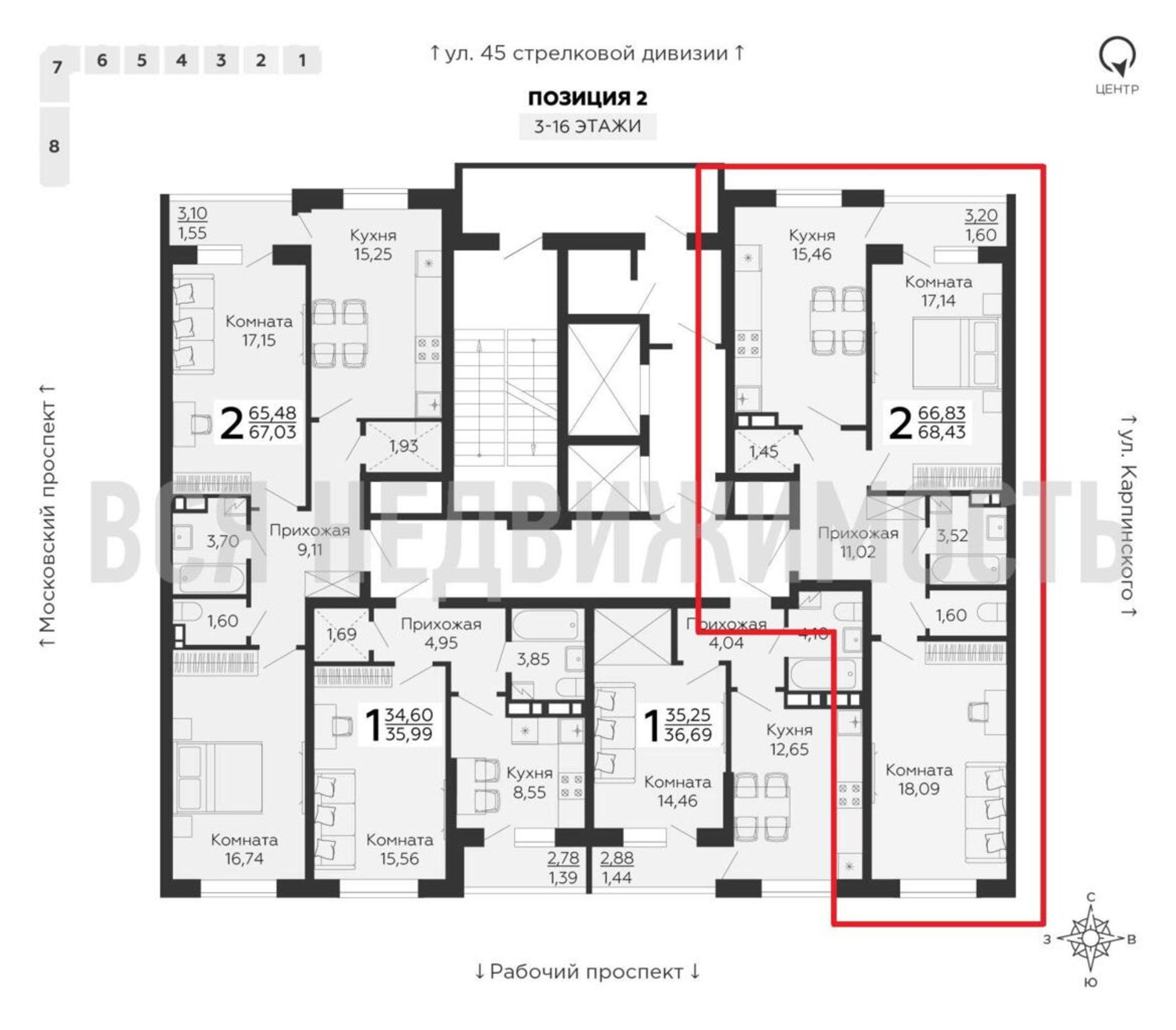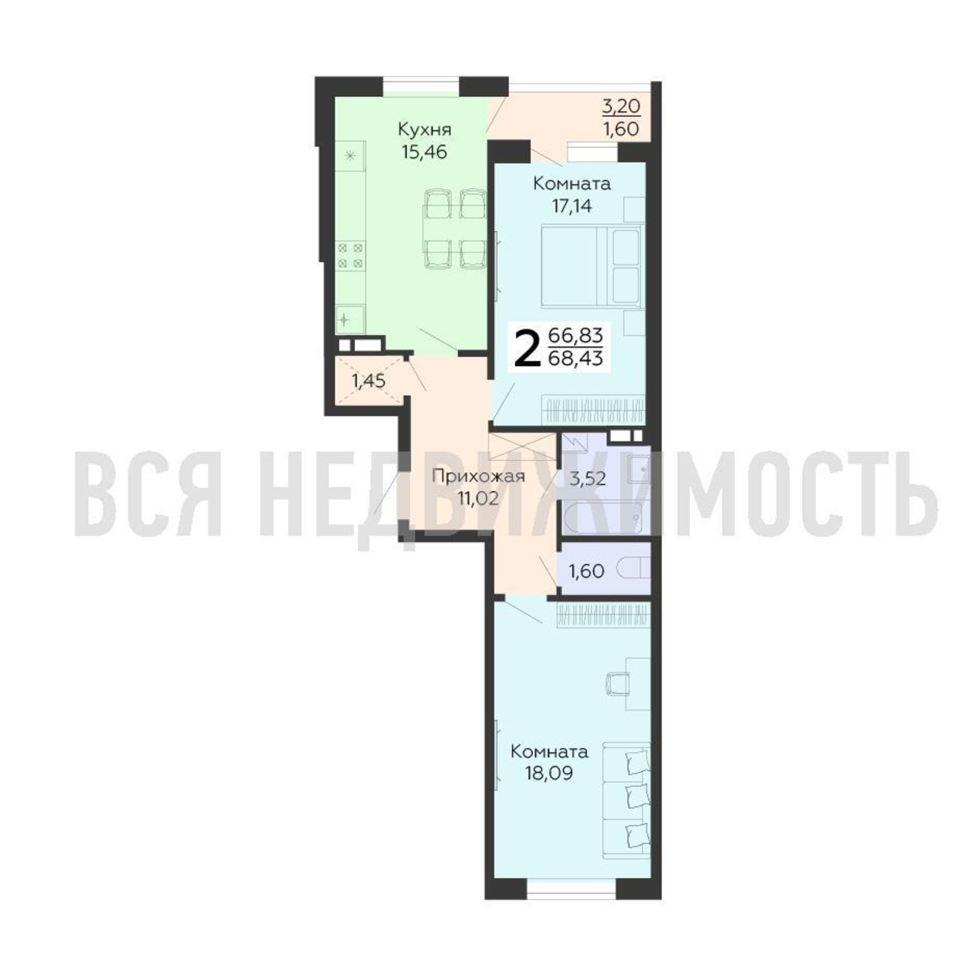 2-комнатная квартира, 68.43 м² 5/16 этаж ID объекта 100076346