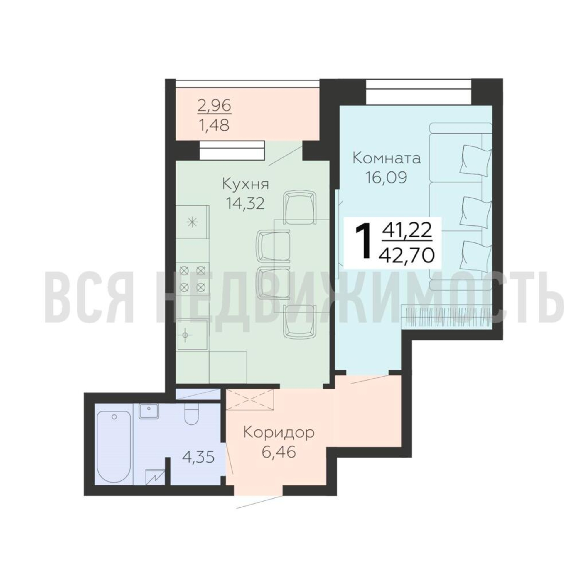 1-комнатная квартира, 42.70 м² 12/24 этаж ID объекта 100076775