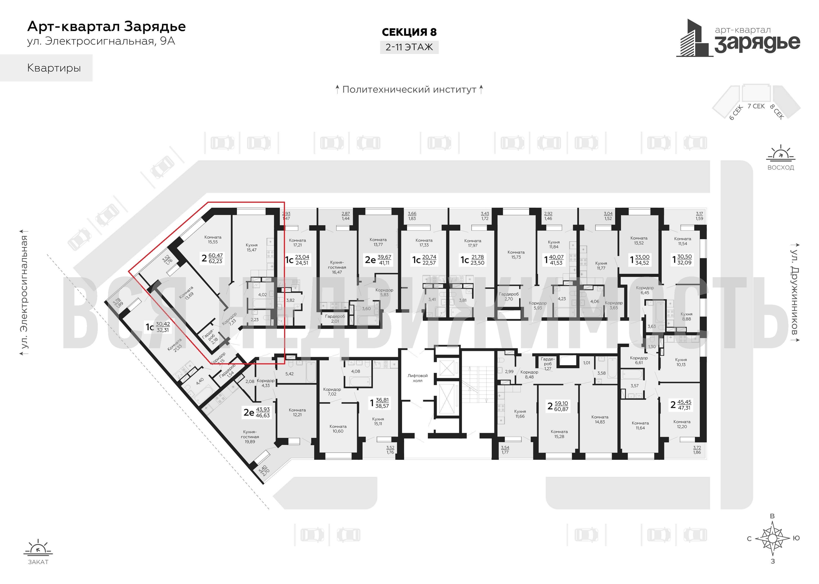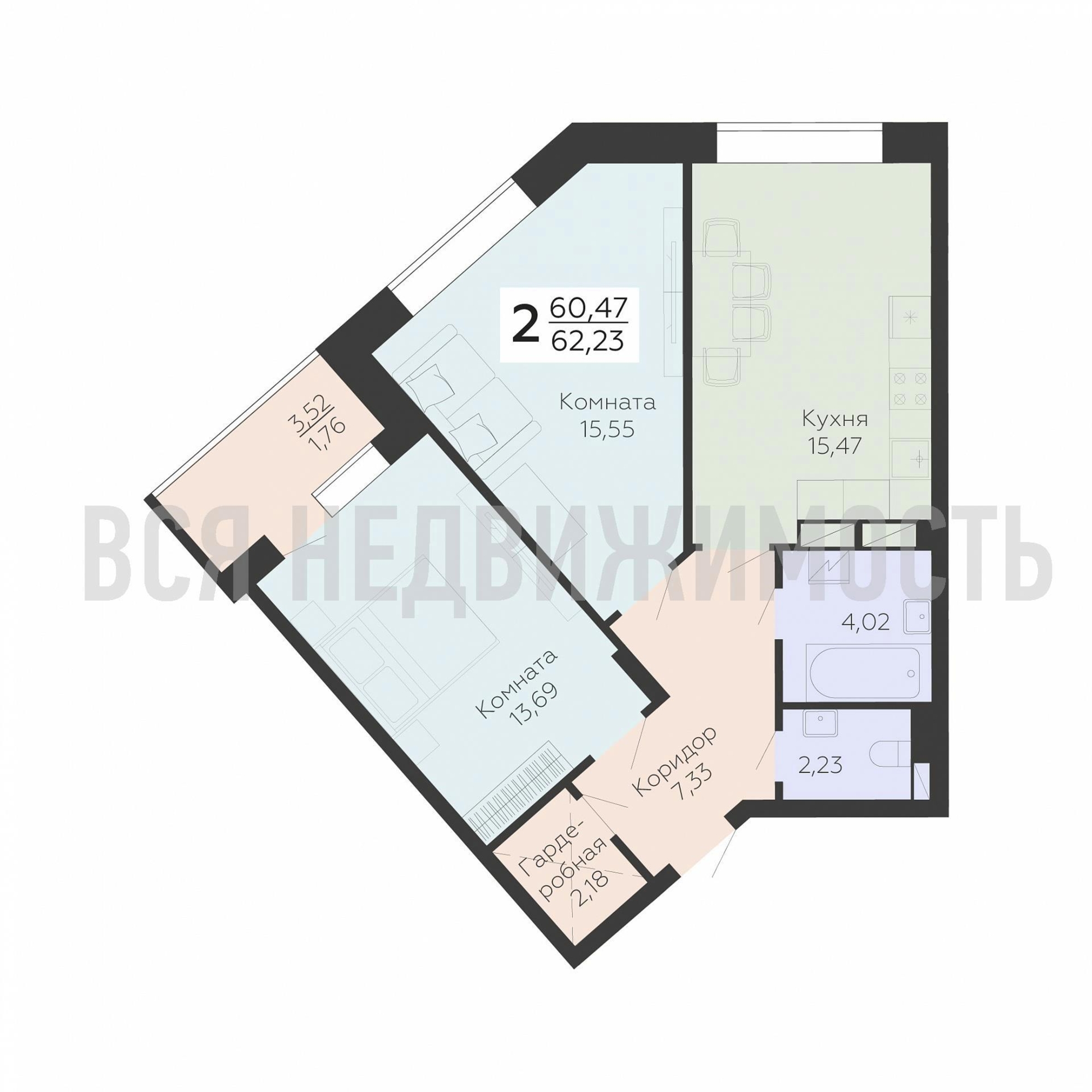 2-комнатная квартира, 62.23 м² 7/13 этаж ID объекта 100077255