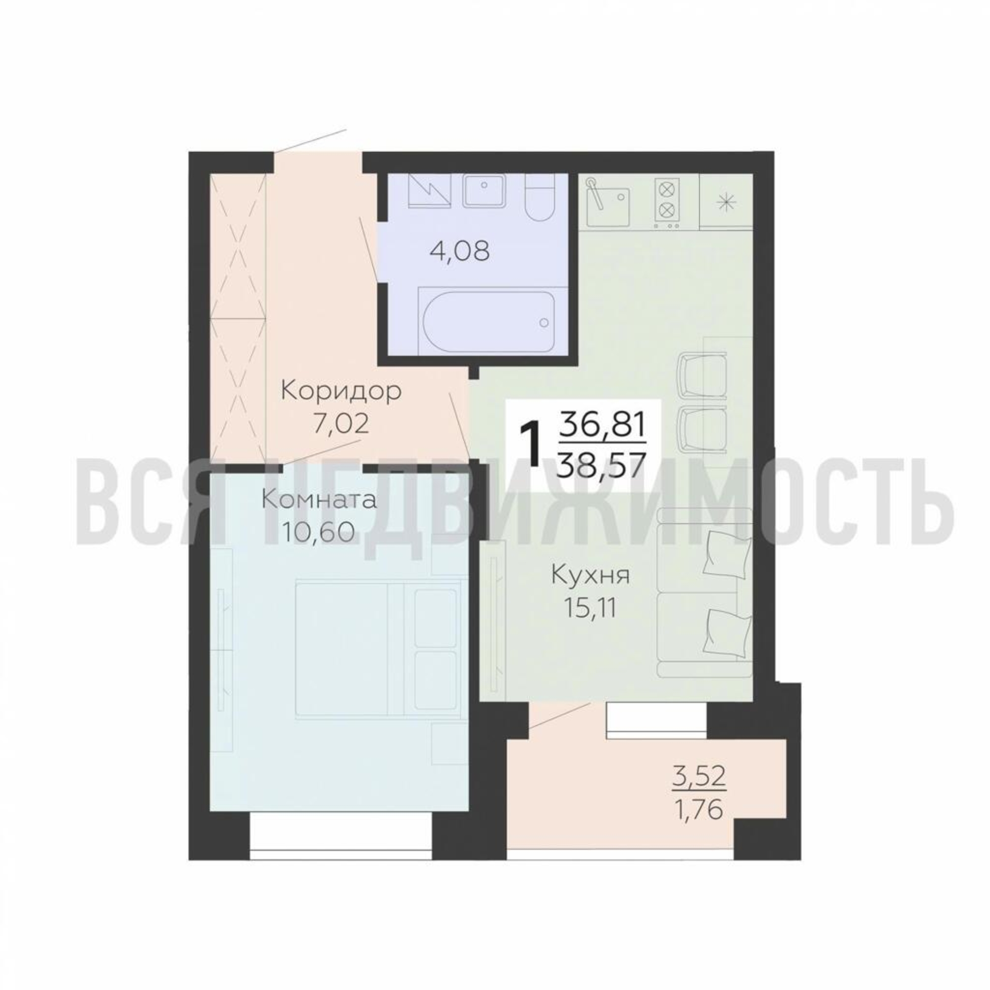 1-комнатная квартира, 38.57 м² 11/13 этаж ID объекта 100077304