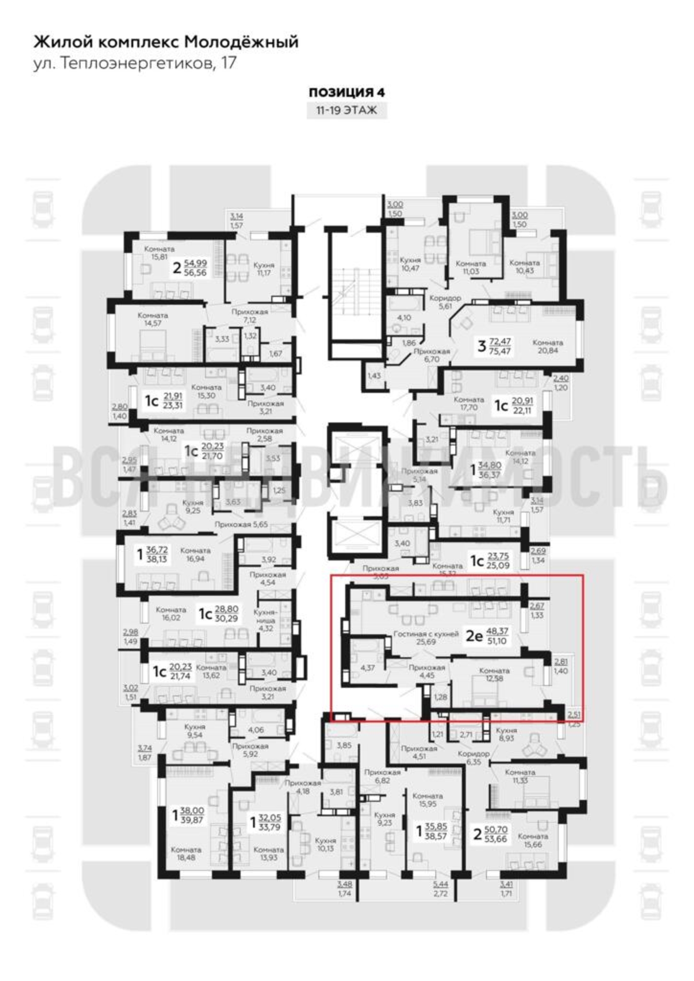 1-комнатная квартира, 51.10 м² 15/19 этаж ID объекта 100077502