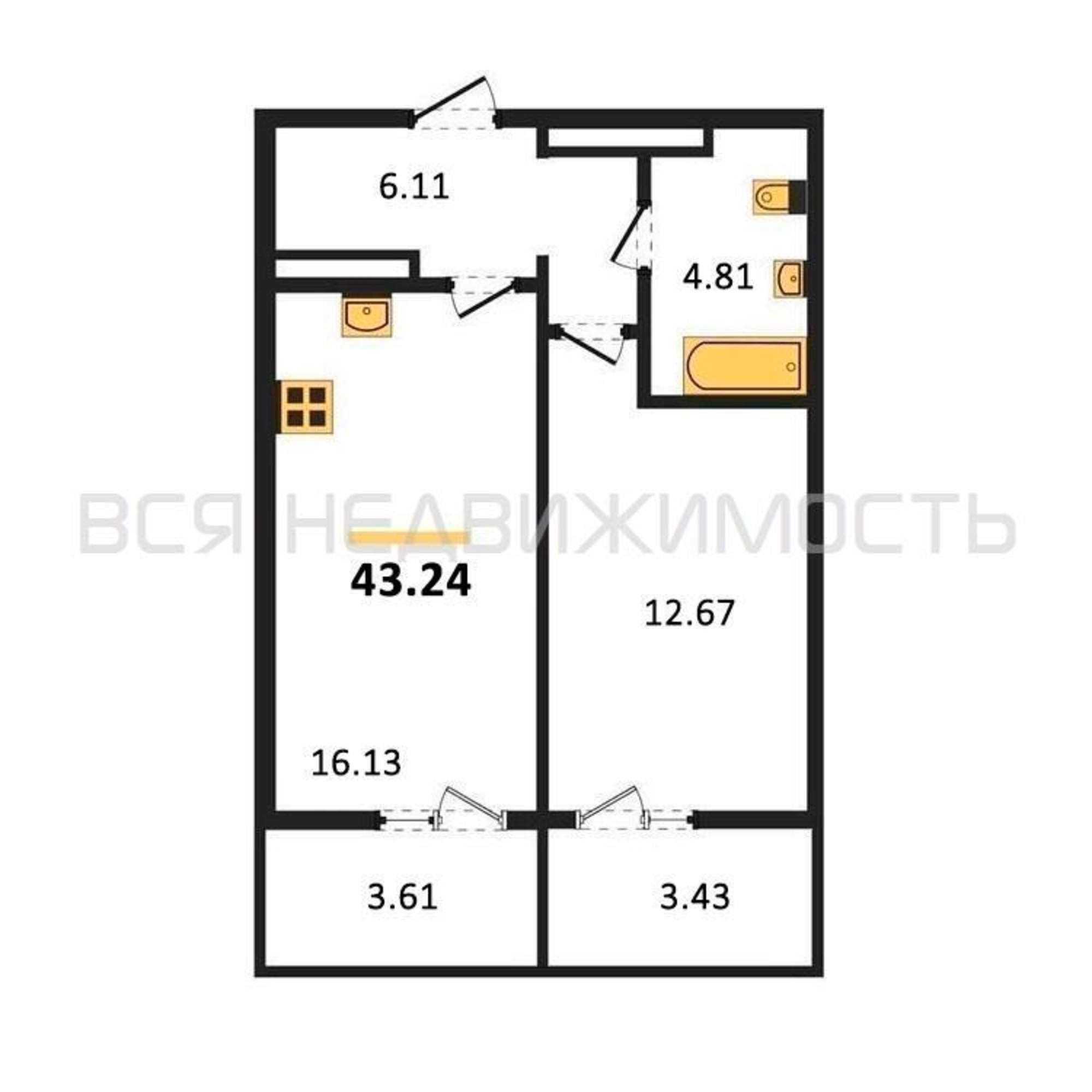 1-комнатная квартира, 43.24 м² 18/18 этаж ID объекта 100080655