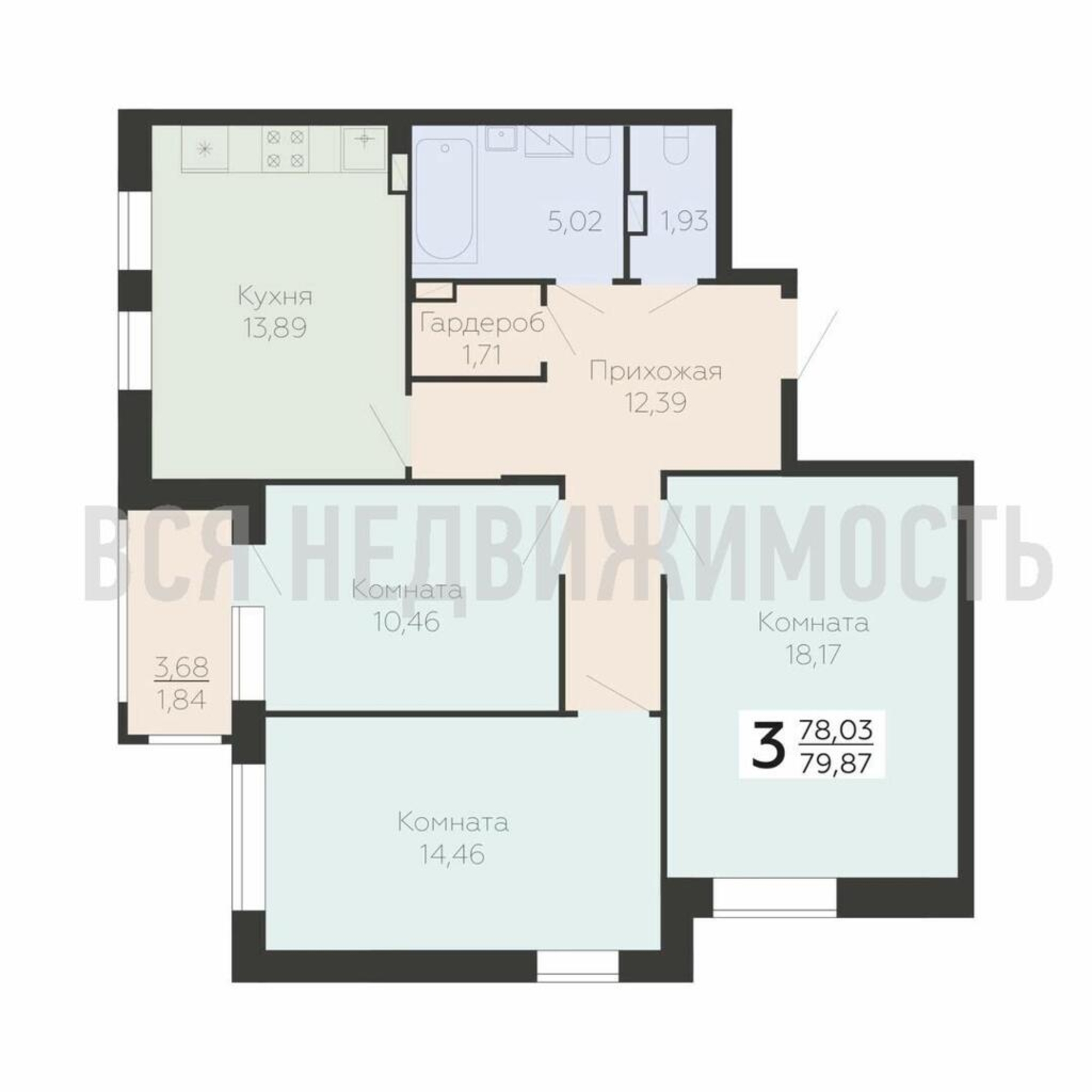 3-комнатная квартира, 79.87 м² 3/13 этаж ID объекта 100080766