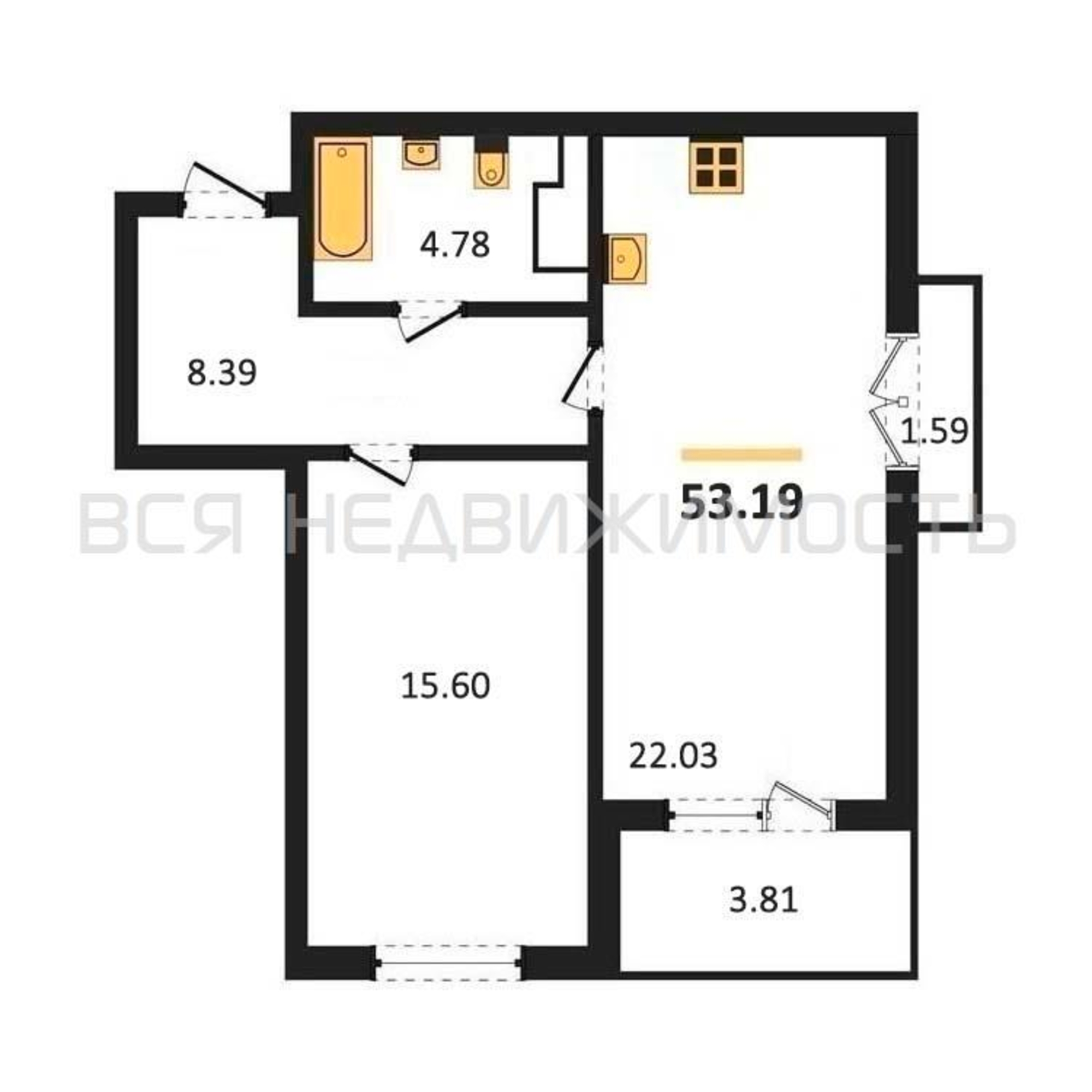 1-комнатная квартира, 53.19 м² 10/18 этаж ID объекта 100082654