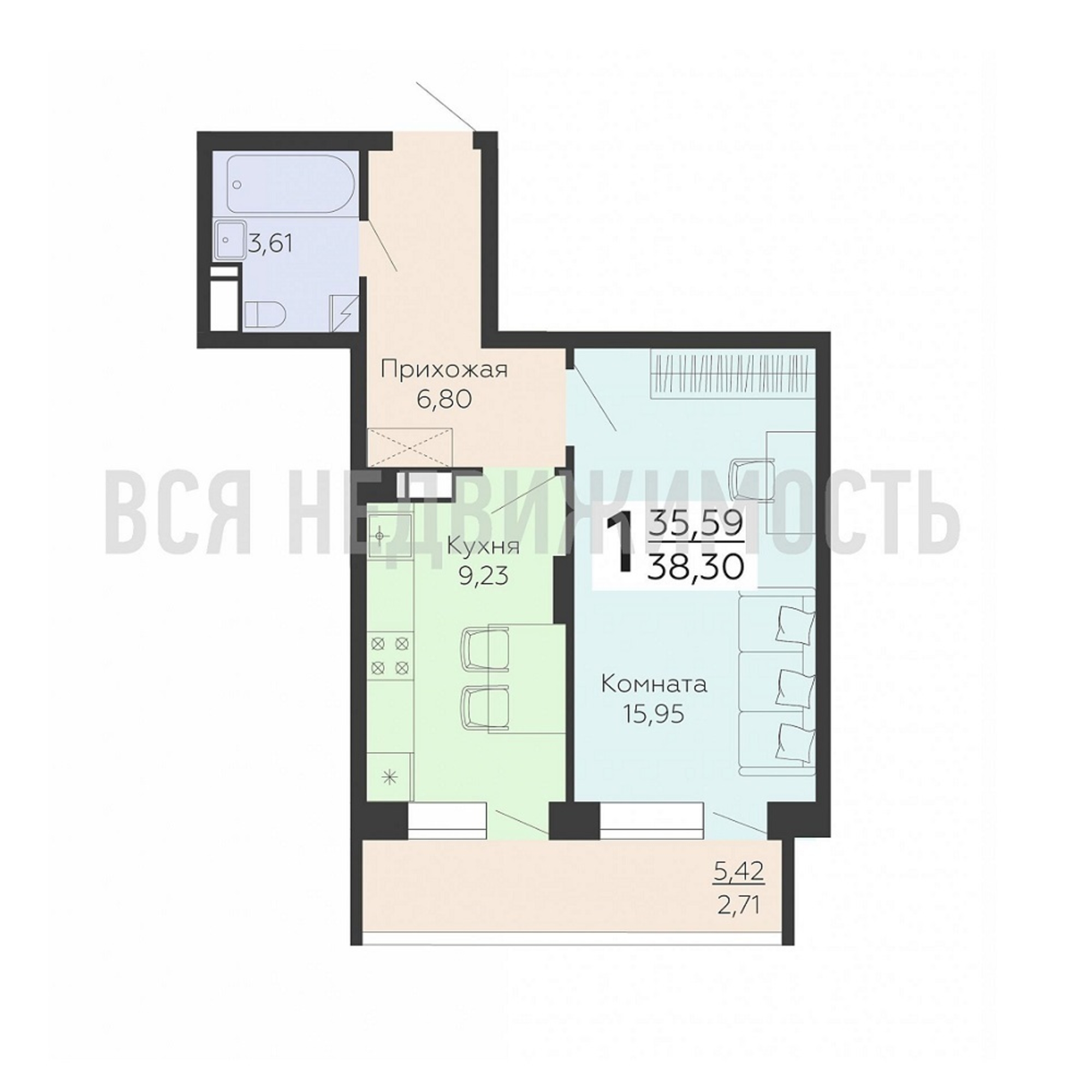 1-комнатная квартира, 38.30 м² 9/19 этаж ID объекта 100090145