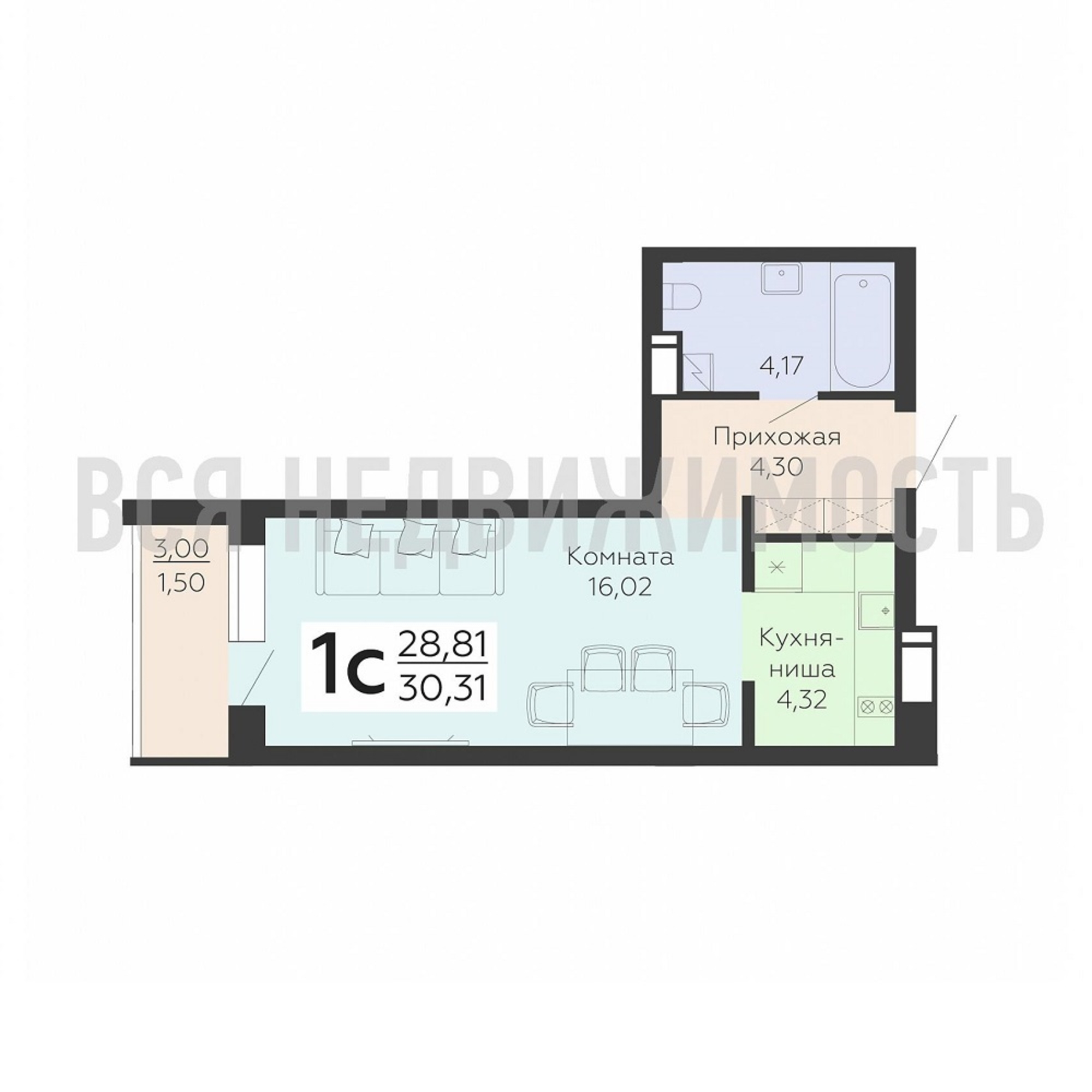 Квартиры-студии, 30.31 м² 9/19 этаж ID объекта 100090148