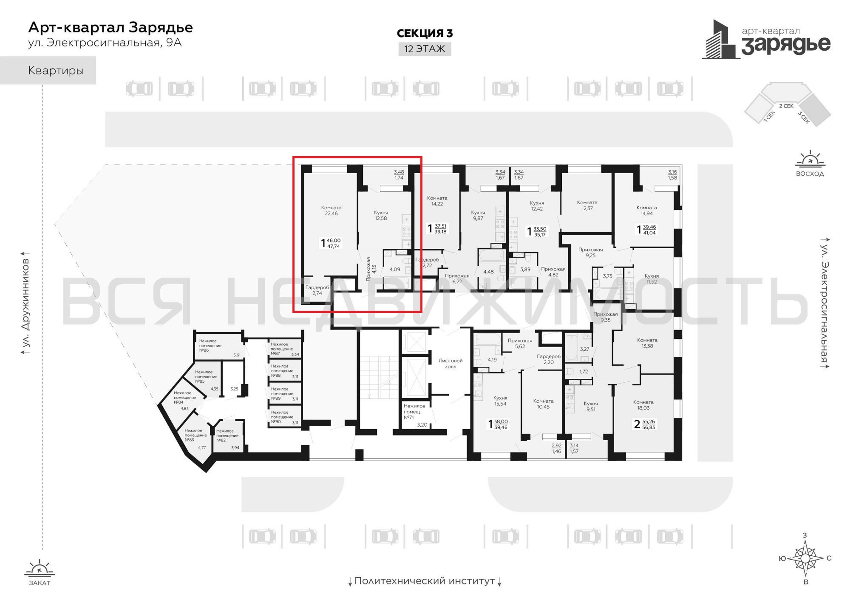 1-комнатная квартира, 47.74 м² 12/15 этаж ID объекта 100091564