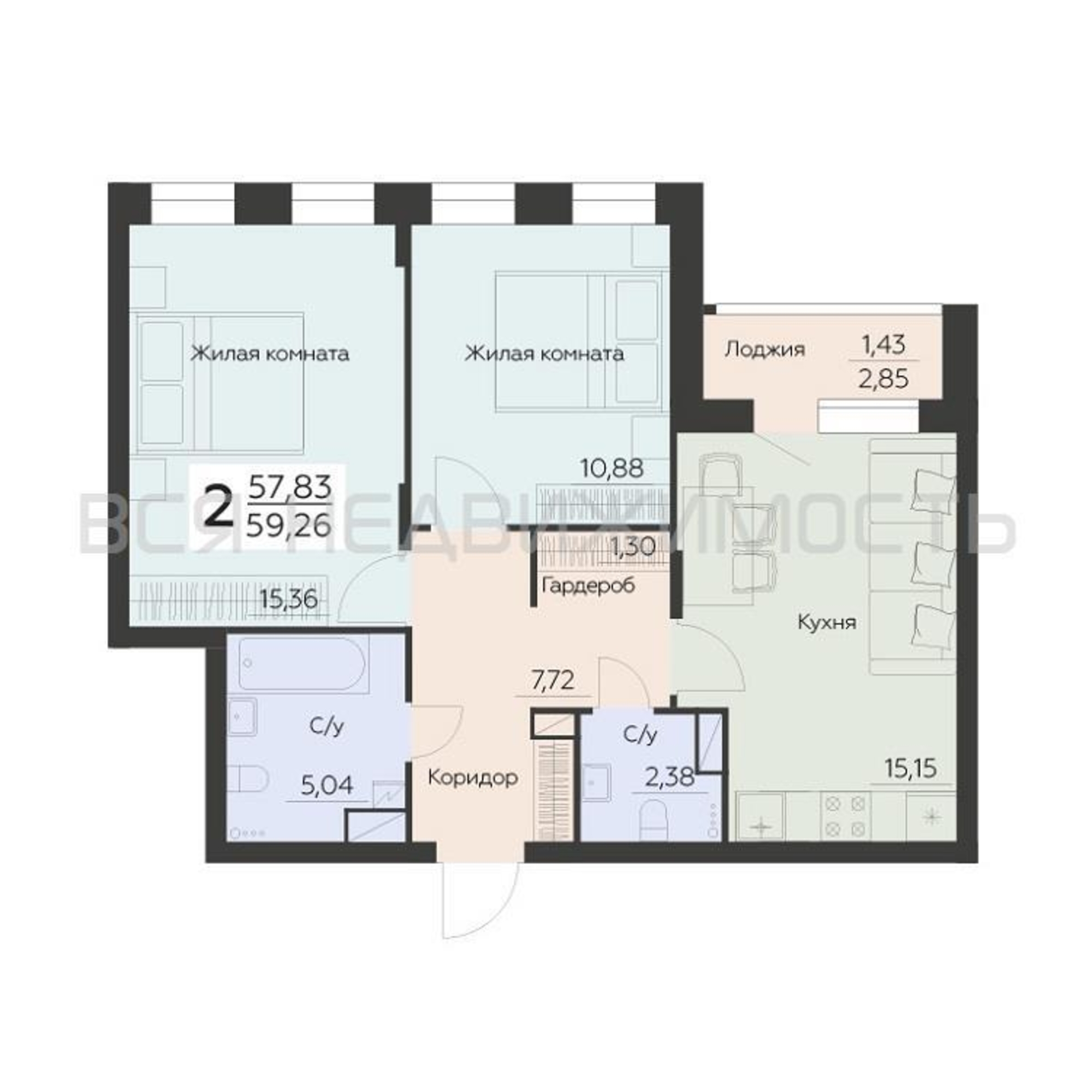 2-комнатная квартира, 59.26 м² 6/16 этаж ID объекта 100092011