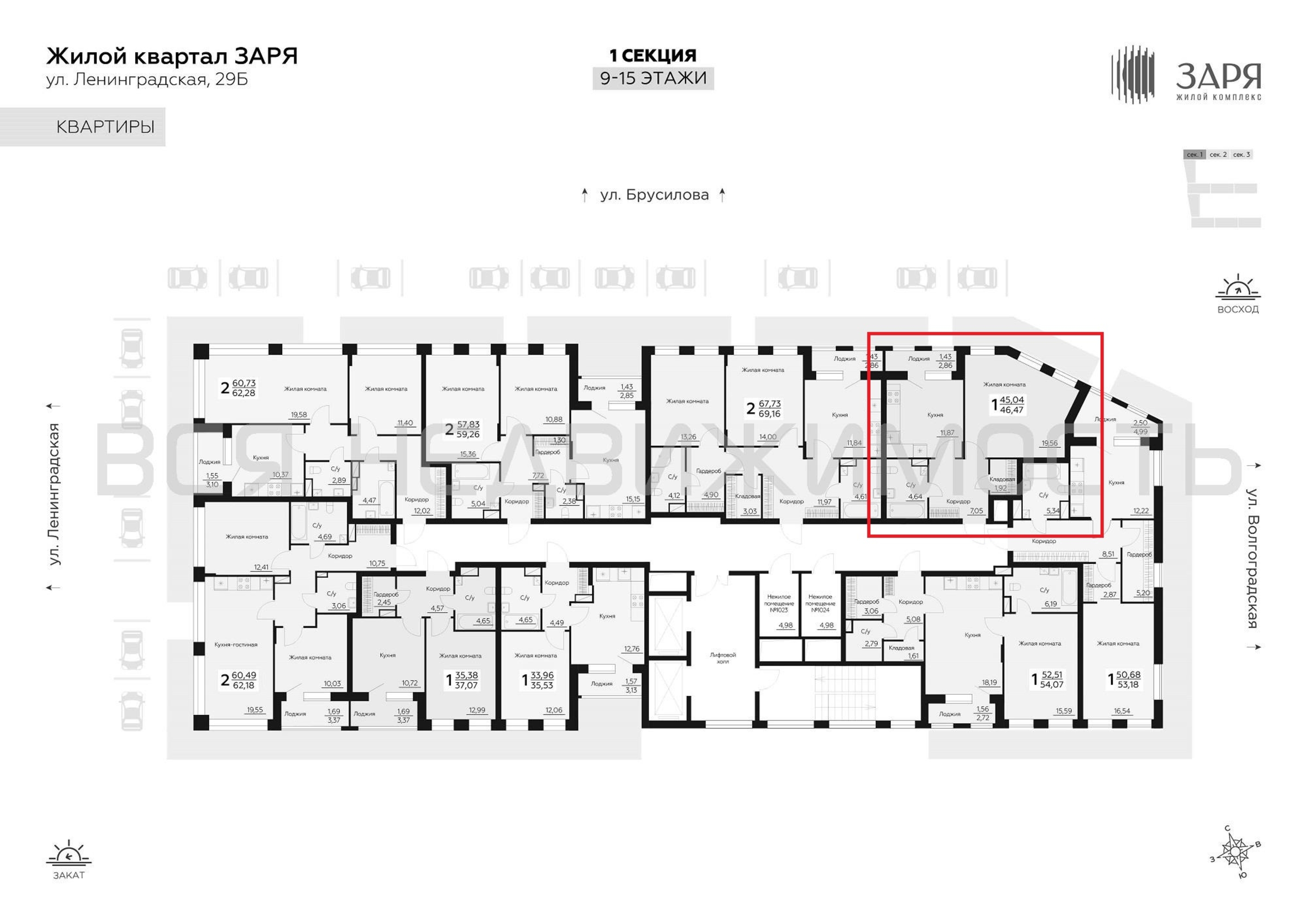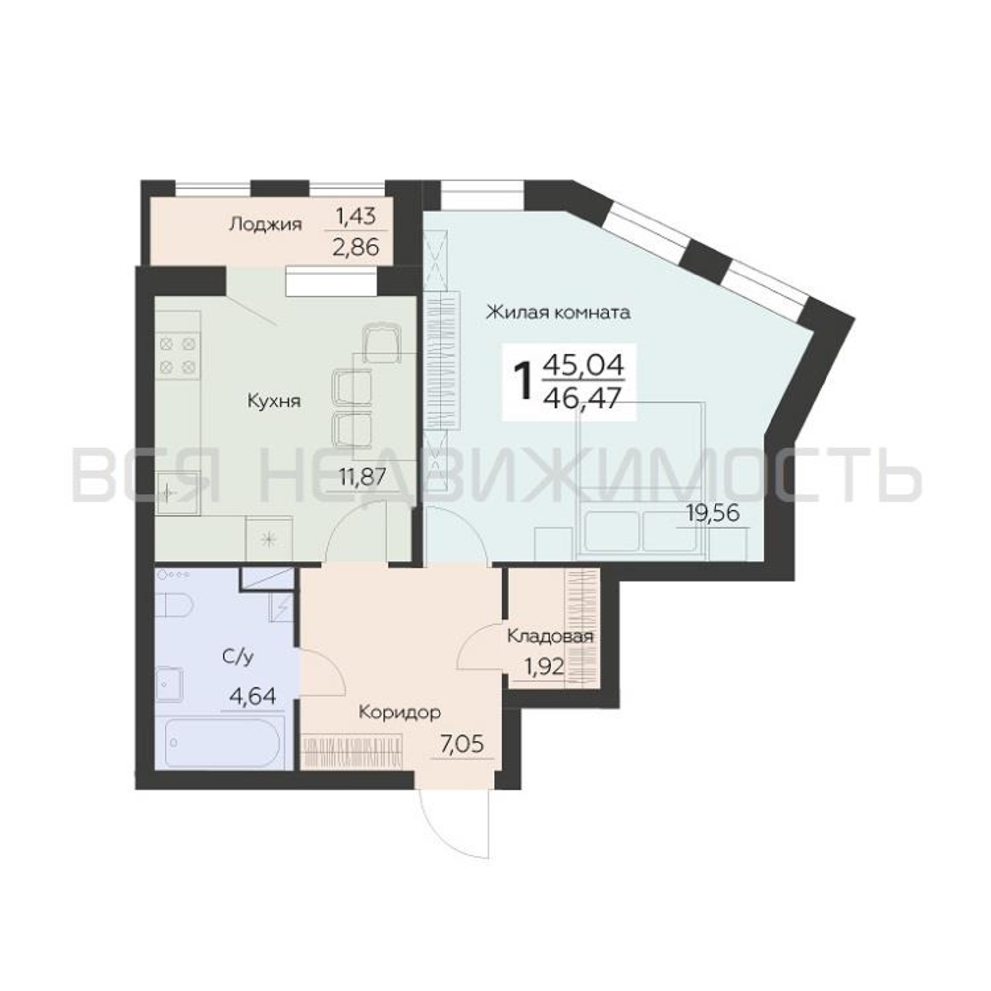 1-комнатная квартира, 46.47 м² 15/16 этаж ID объекта 100092094