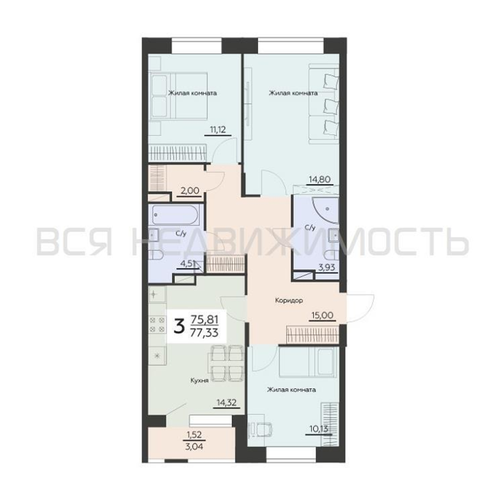 3-комнатная квартира, 77.33 м² 3/8 этаж ID объекта 100092106
