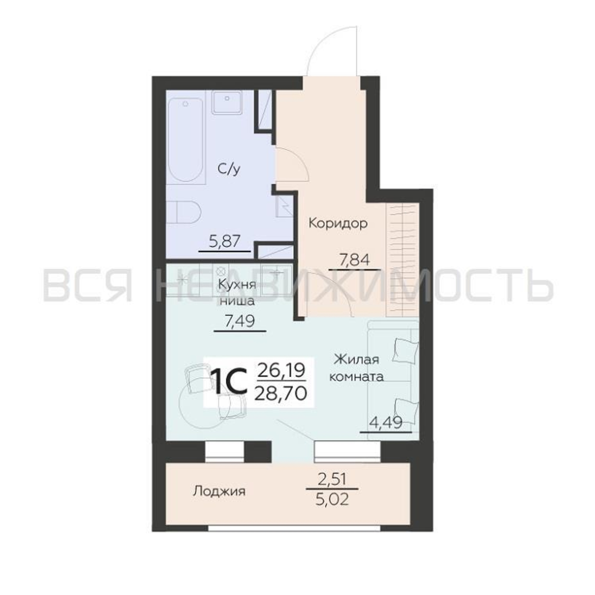 Квартиры-студии, 28.70 м² 5/14 этаж ID объекта 100092189