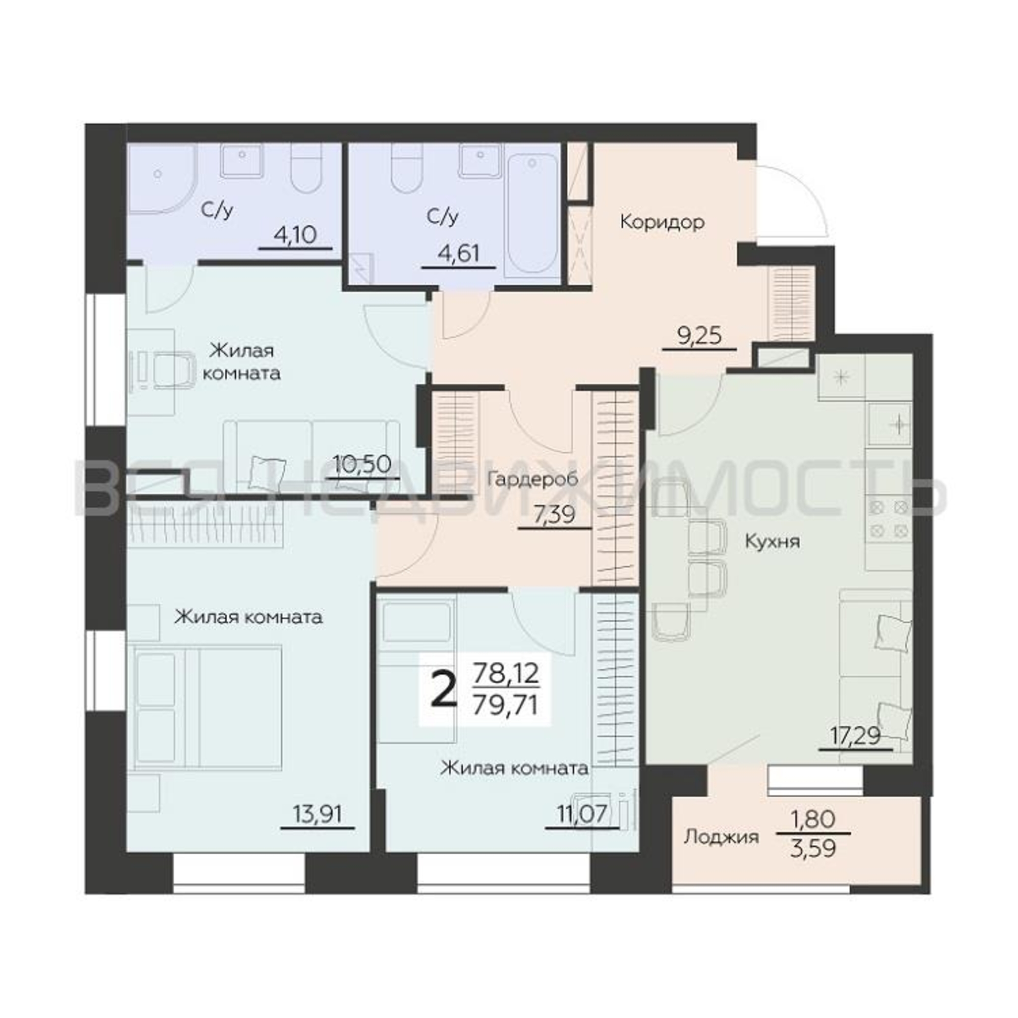 3-комнатная квартира, 79.71 м² 12/14 этаж ID объекта 100092265
