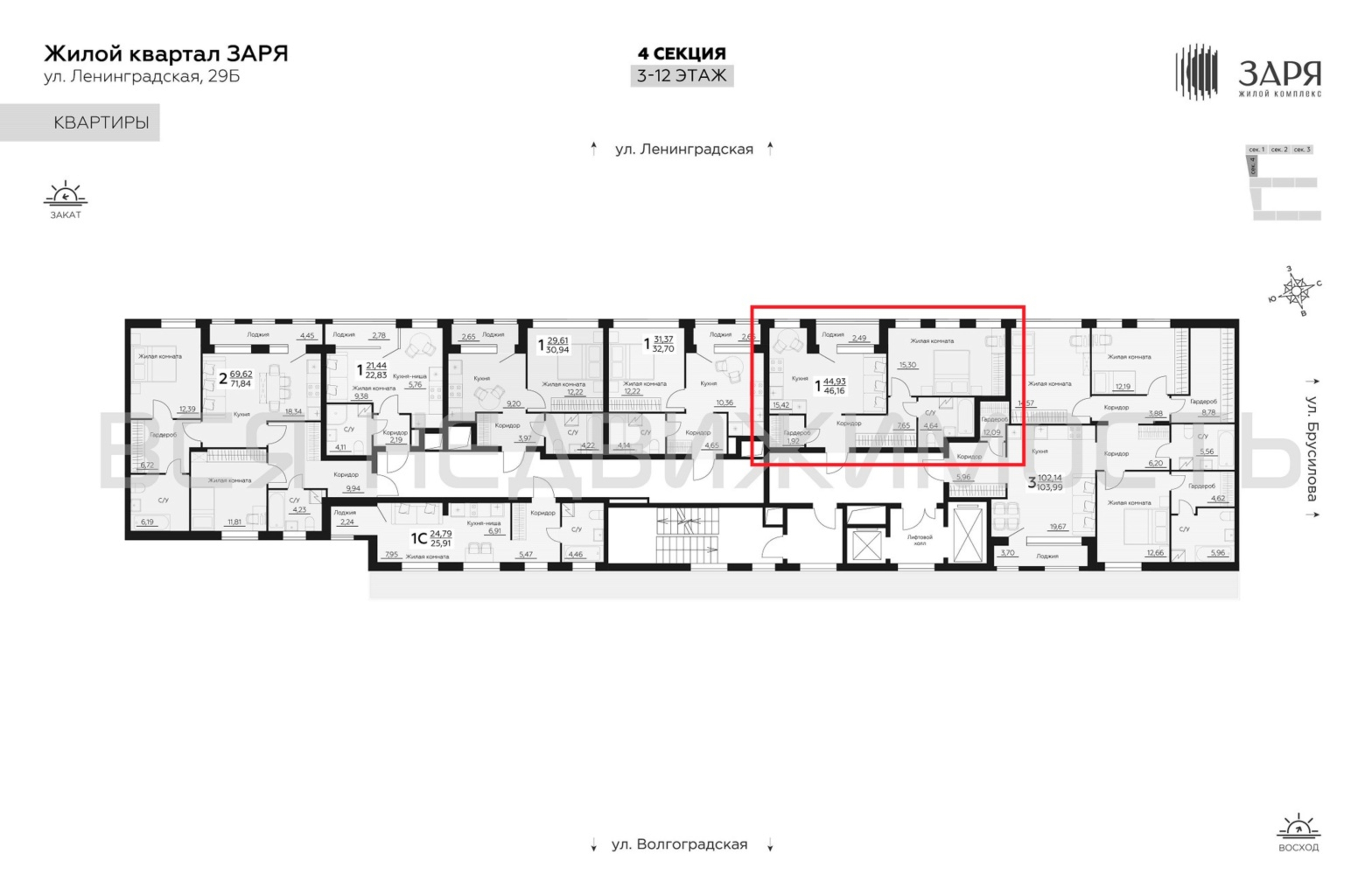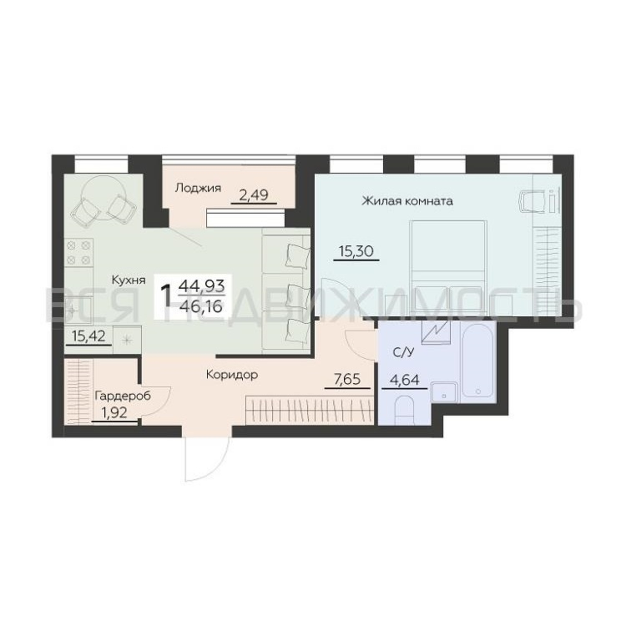 1-комнатная квартира, 46.16 м² 12/12 этаж ID объекта 100092485