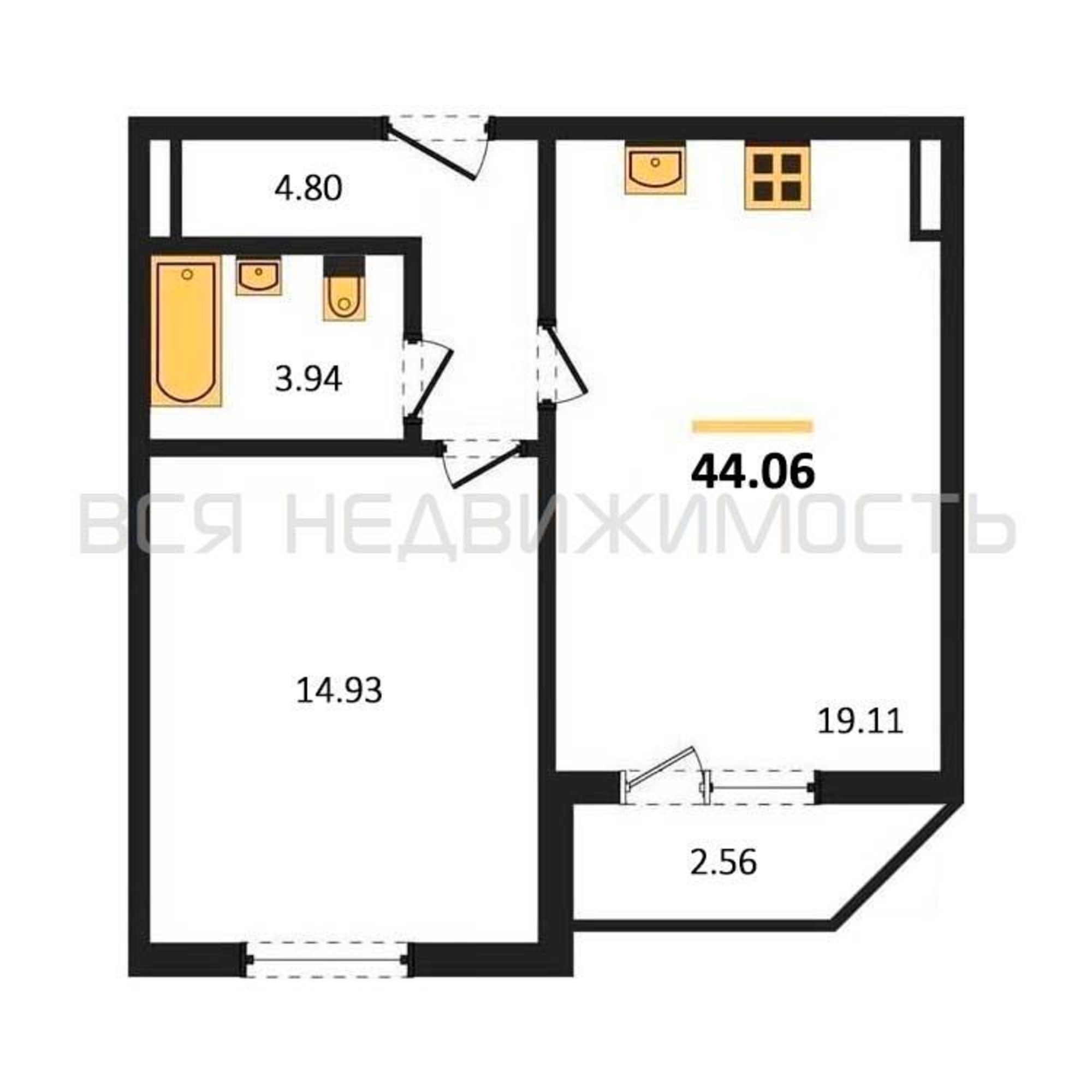 1-комнатная квартира, 44.06 м² 4/14 этаж ID объекта 100093115