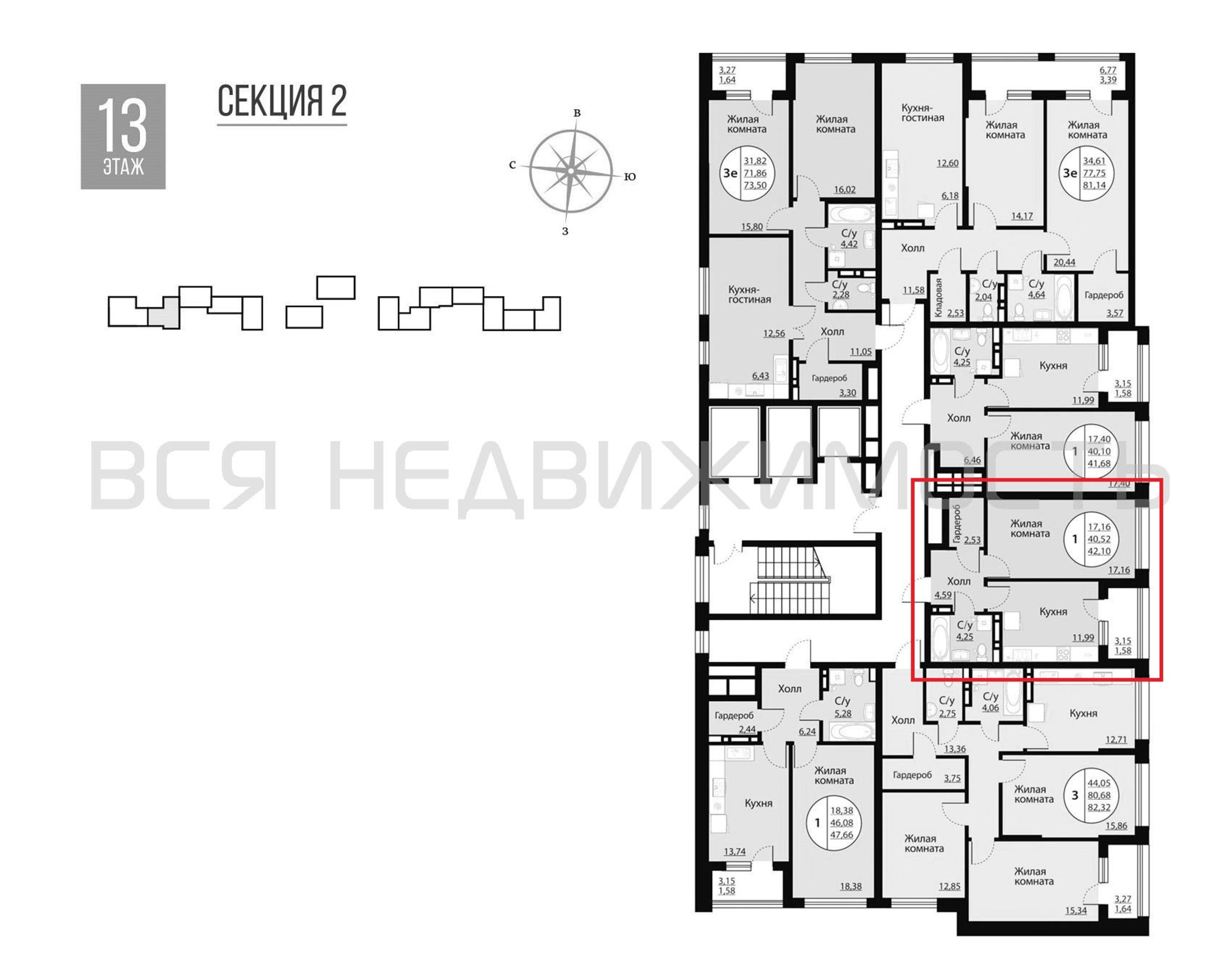 1-комнатная квартира, 41.68 м² 13/14 этаж ID объекта 100093961