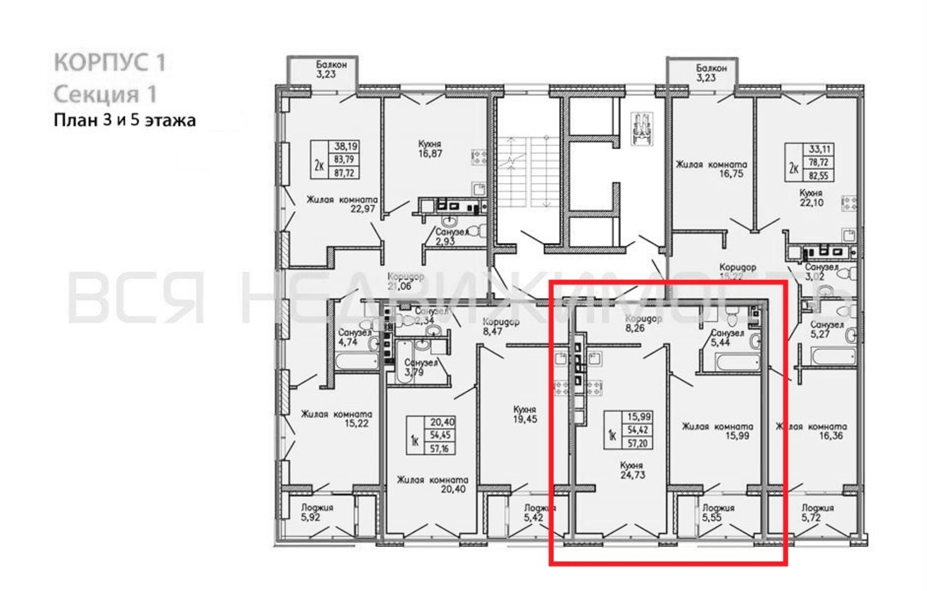 1-комнатная квартира, 57.20 м² 3/9 этаж ID объекта 100094308
