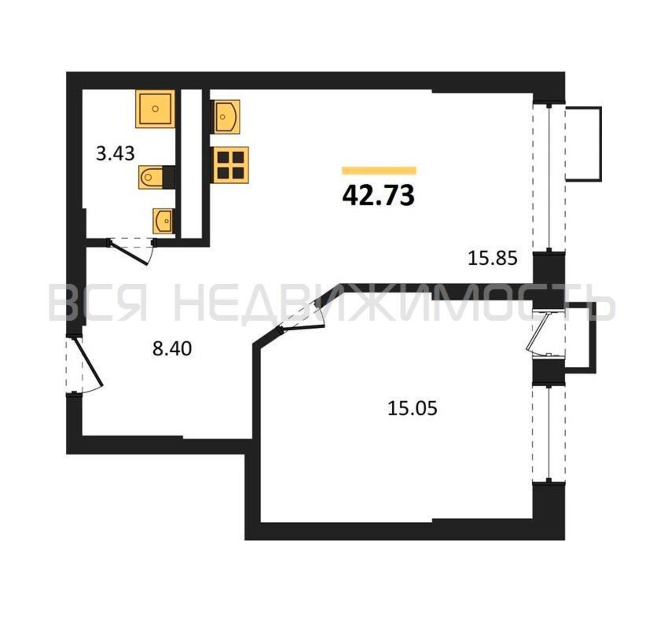 1-комнатная квартира, 42.73 м² 2/19 этаж ID объекта 100096250