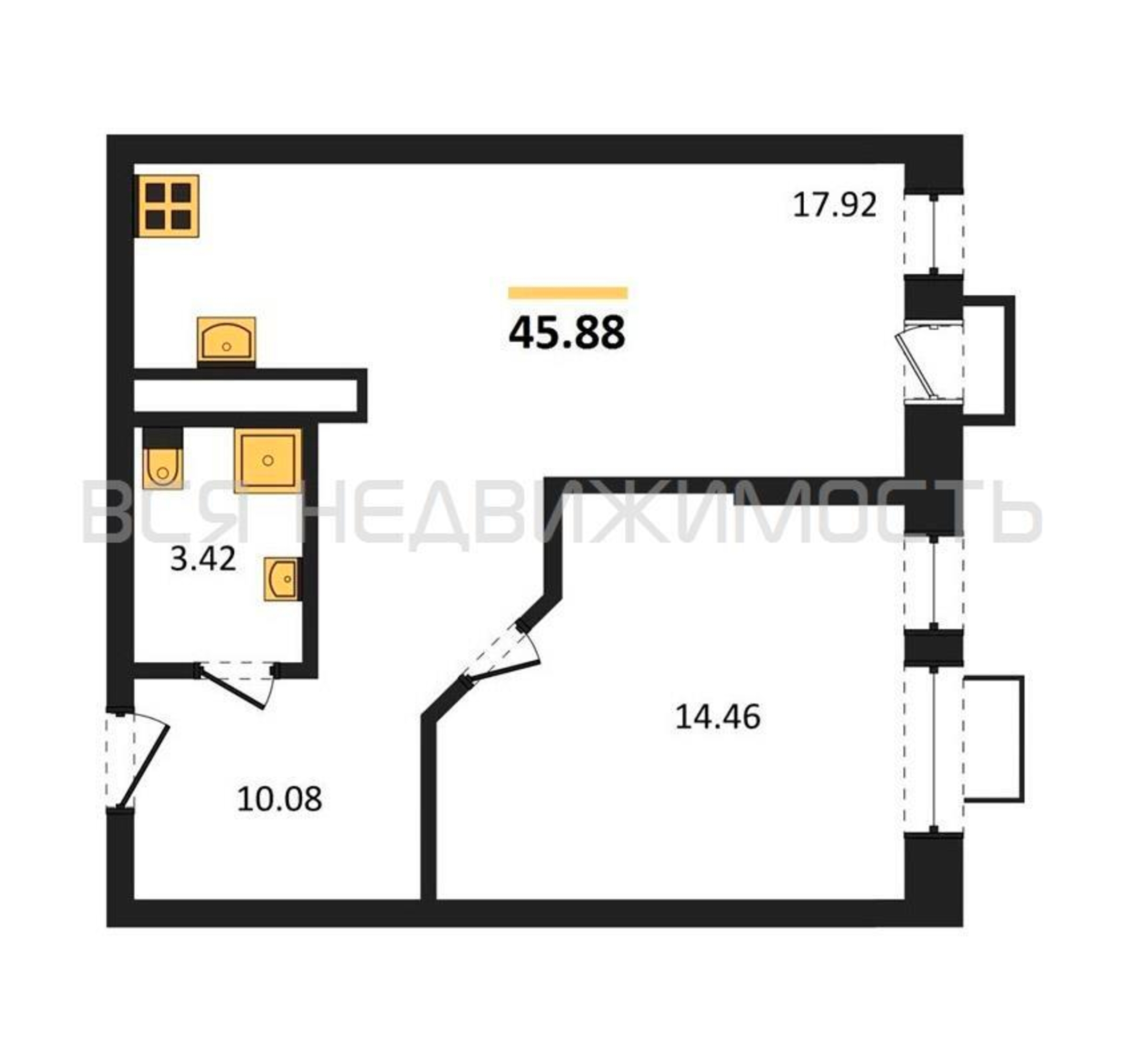 1-комнатная квартира, 45.88 м² 4/19 этаж ID объекта 100096291