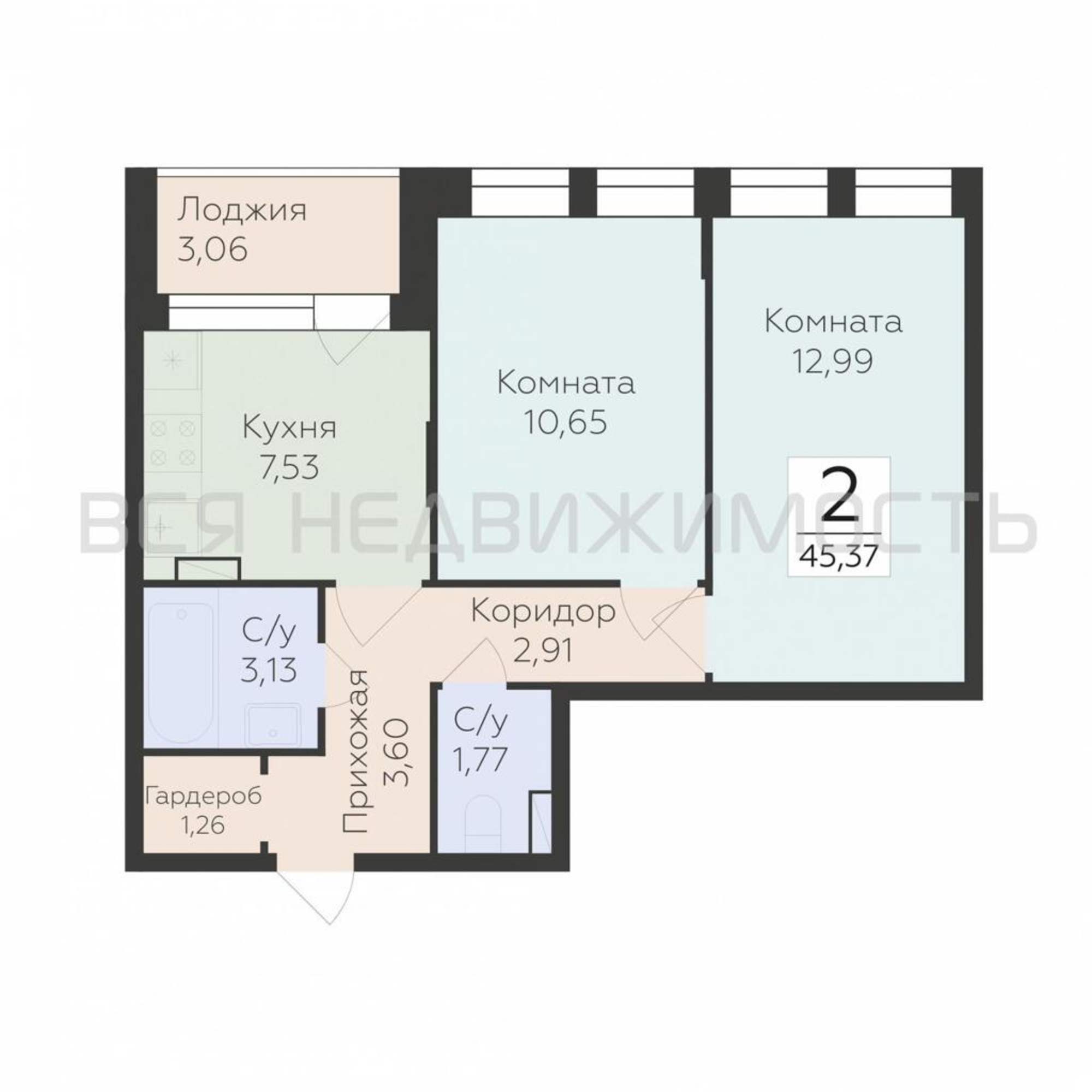 2-комнатная квартира, 45.37 м² 11/21 этаж ID объекта 100097013