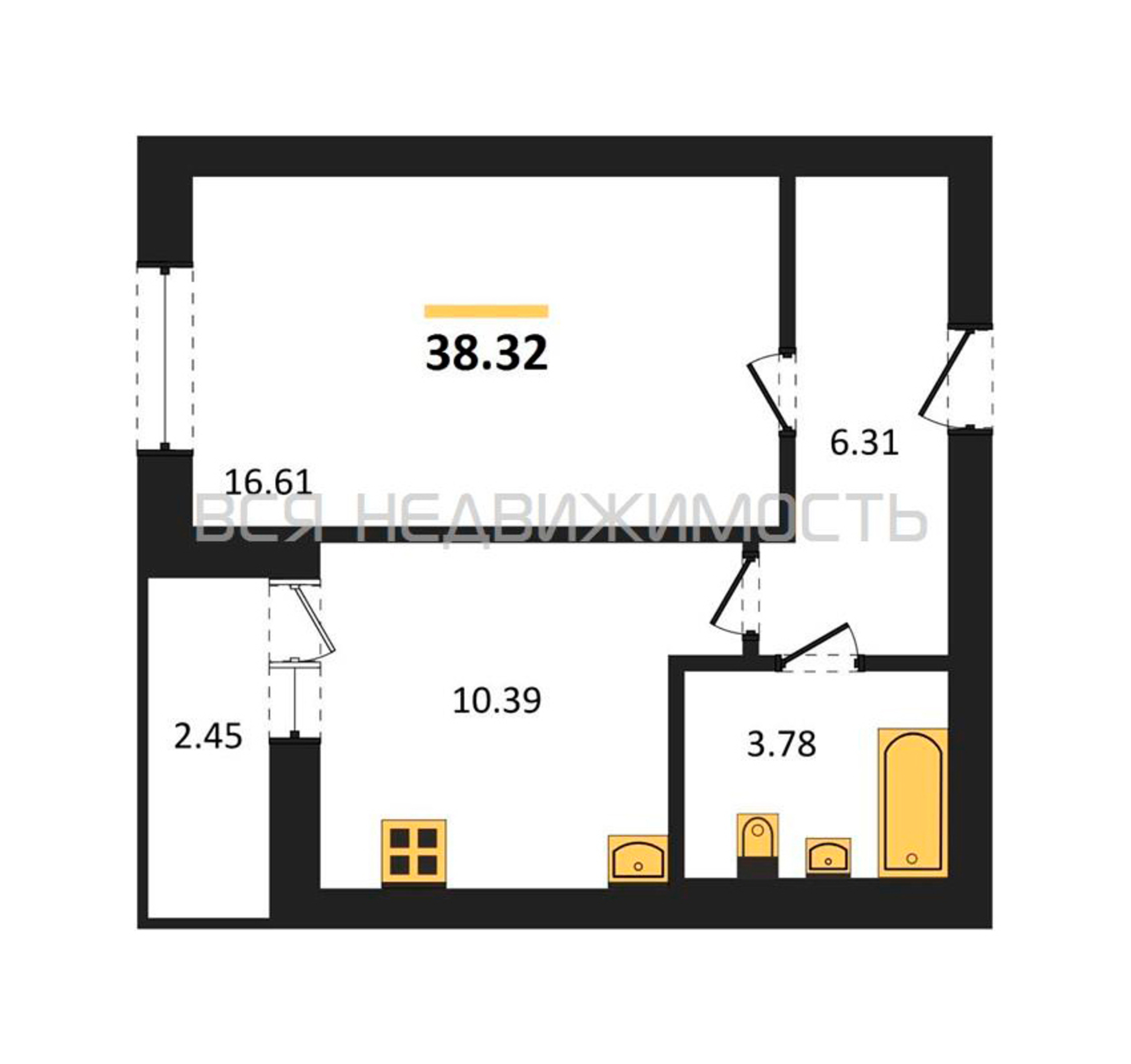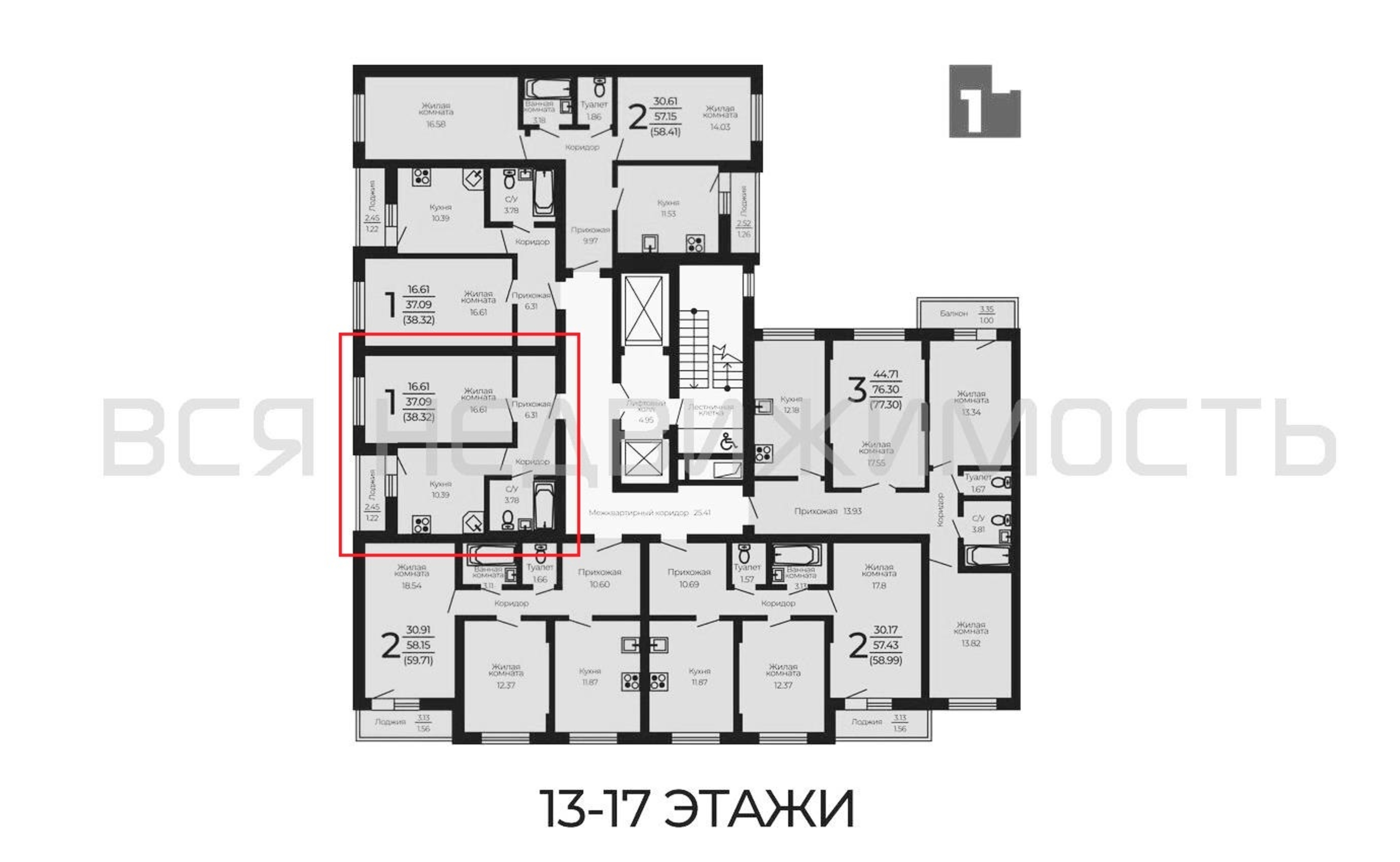 1-комнатная квартира, 38.32 м² 13/17 этаж ID объекта 100099528