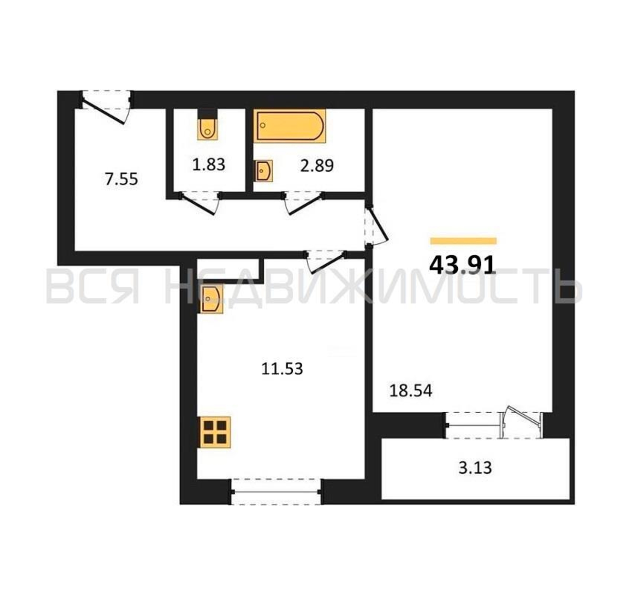 1-комнатная квартира, 43.91 м² 7/17 этаж ID объекта 100100219