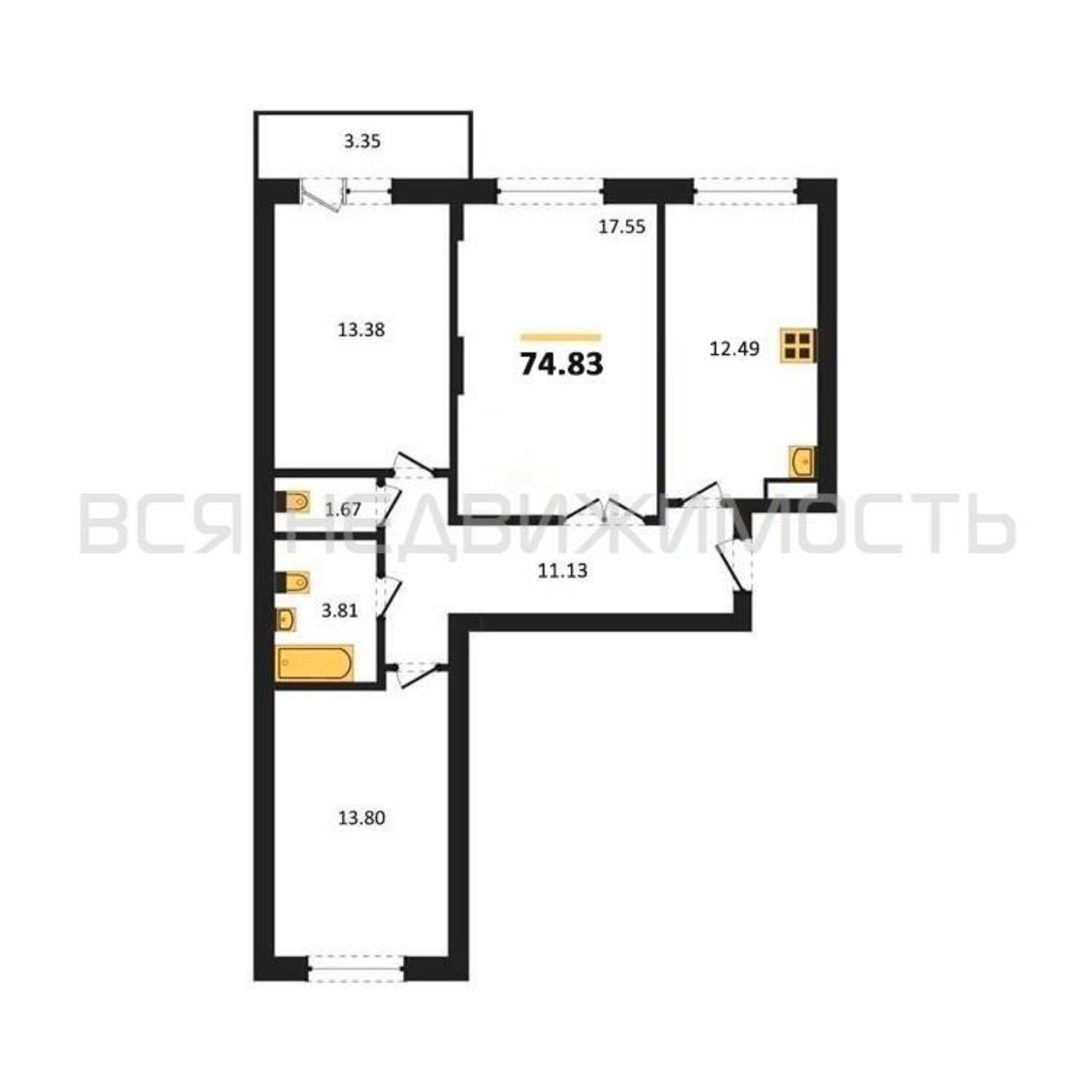 3-комнатная квартира, 74.83 м² 7/17 этаж ID объекта 100100222
