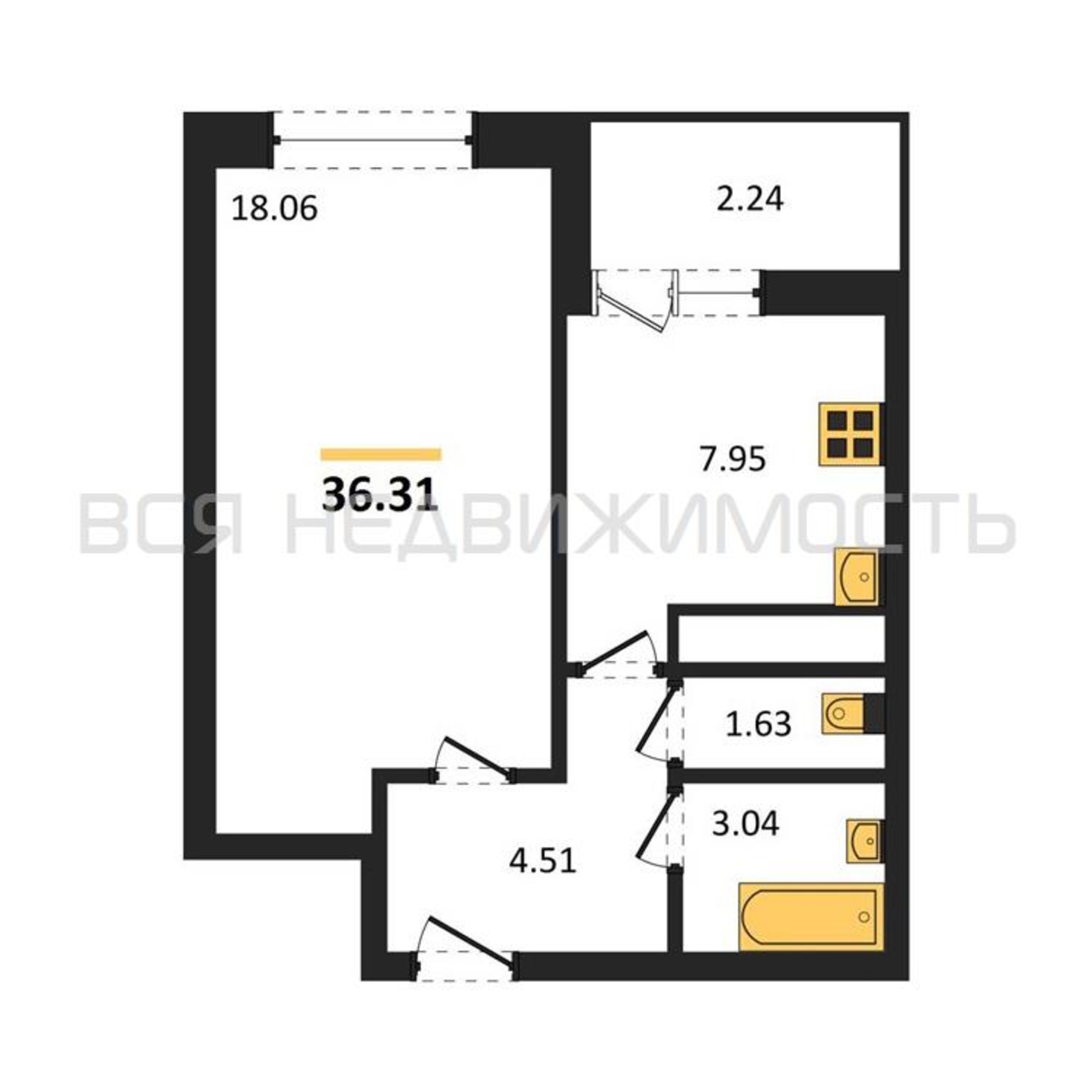 1-комнатная квартира, 36.31 м² 23/25 этаж ID объекта 100101490
