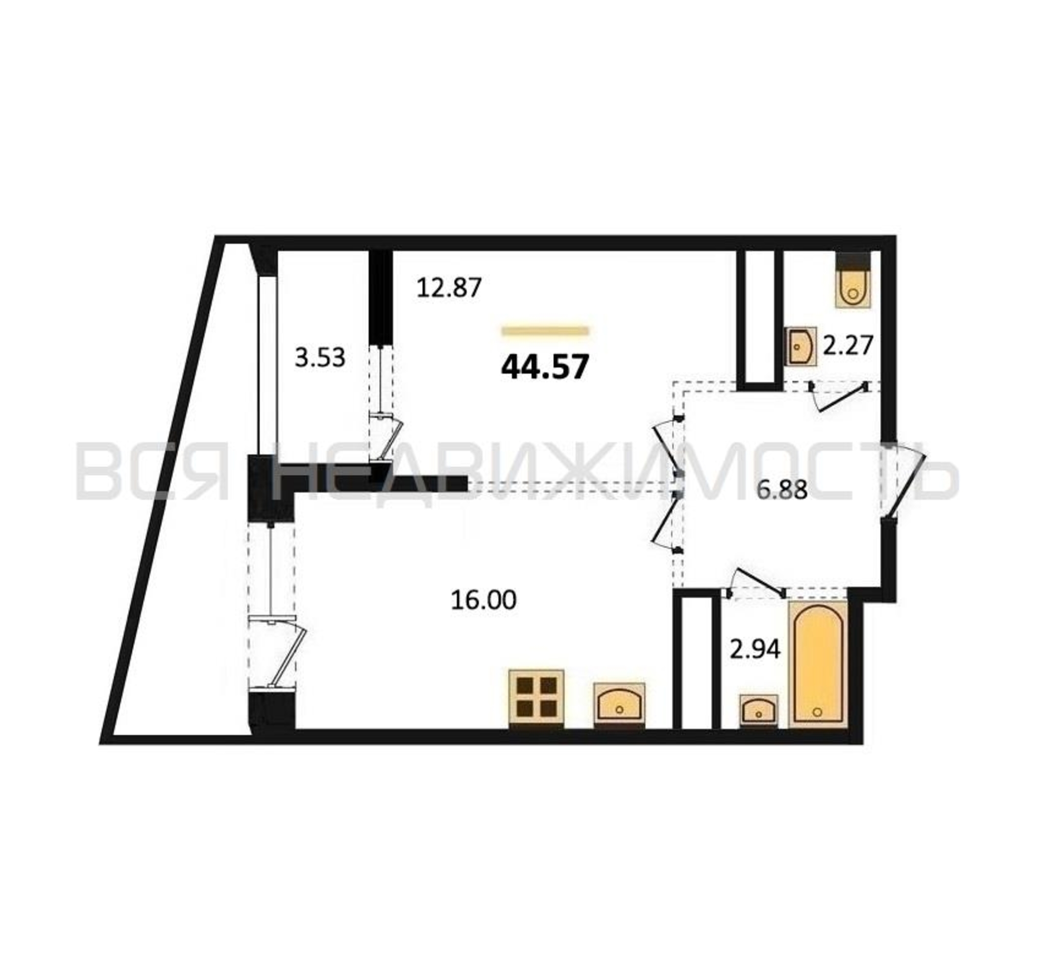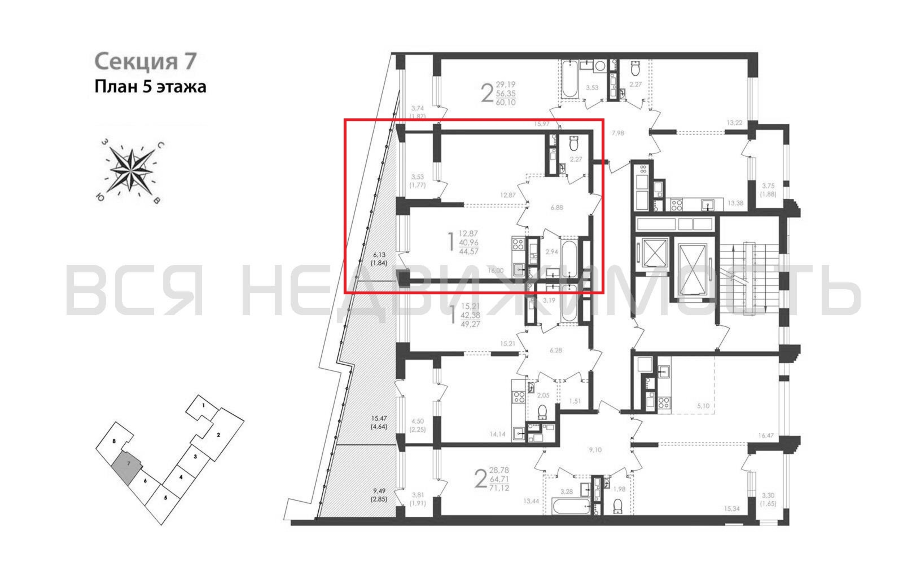 1-комнатная квартира, 44.57 м² 5/14 этаж ID объекта 100102172