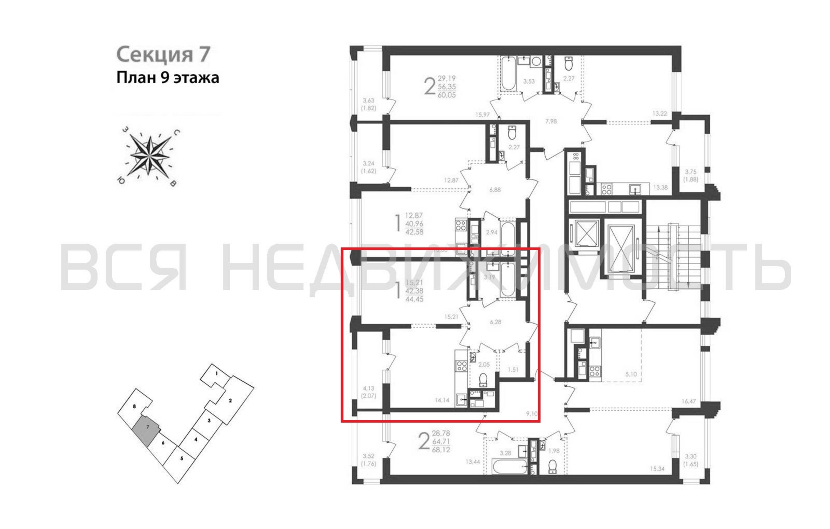 1-комнатная квартира, 44.45 м² 9/14 этаж ID объекта 100102180