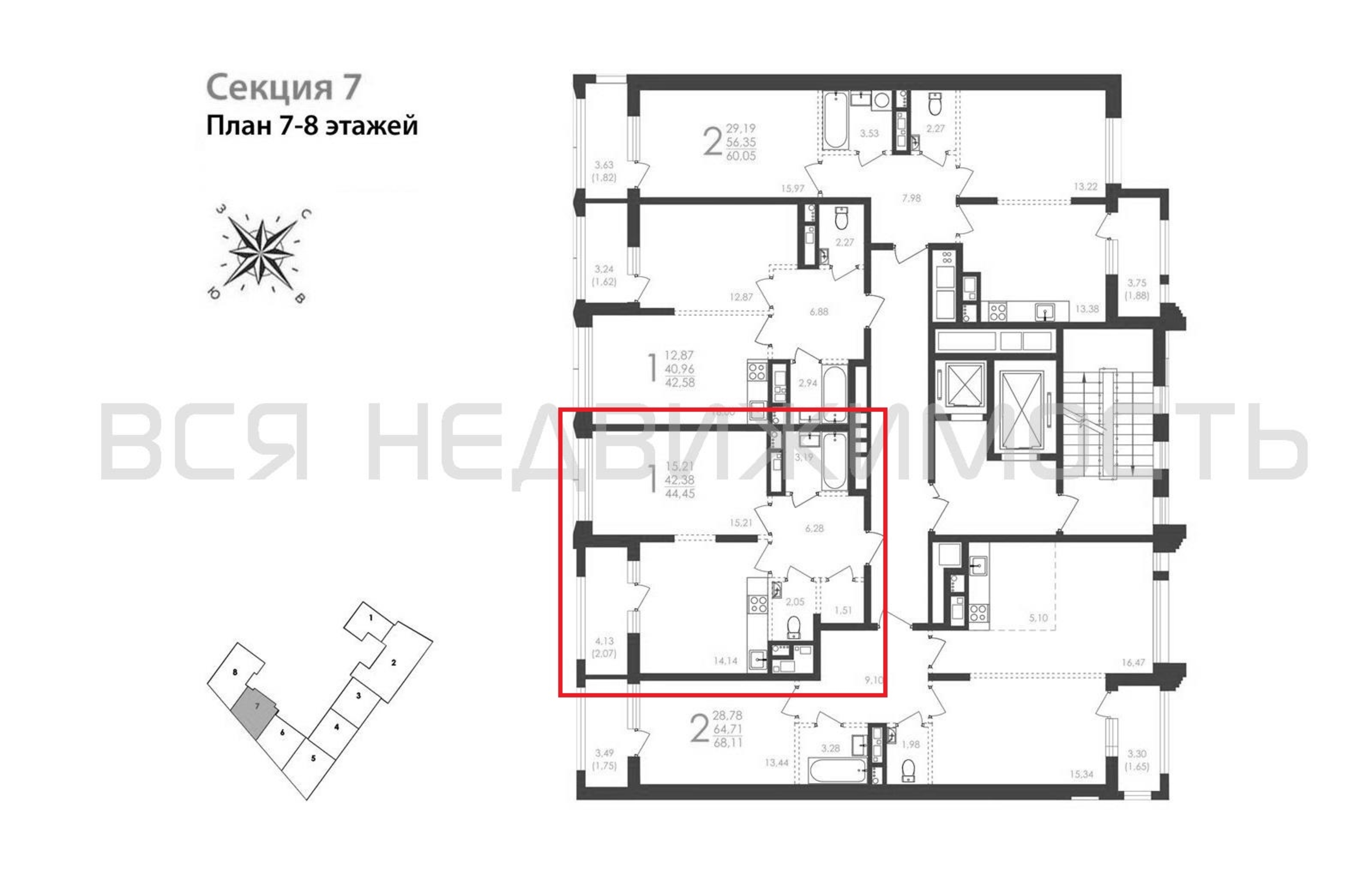 1-комнатная квартира, 44.45 м² 8/14 этаж ID объекта 100102183
