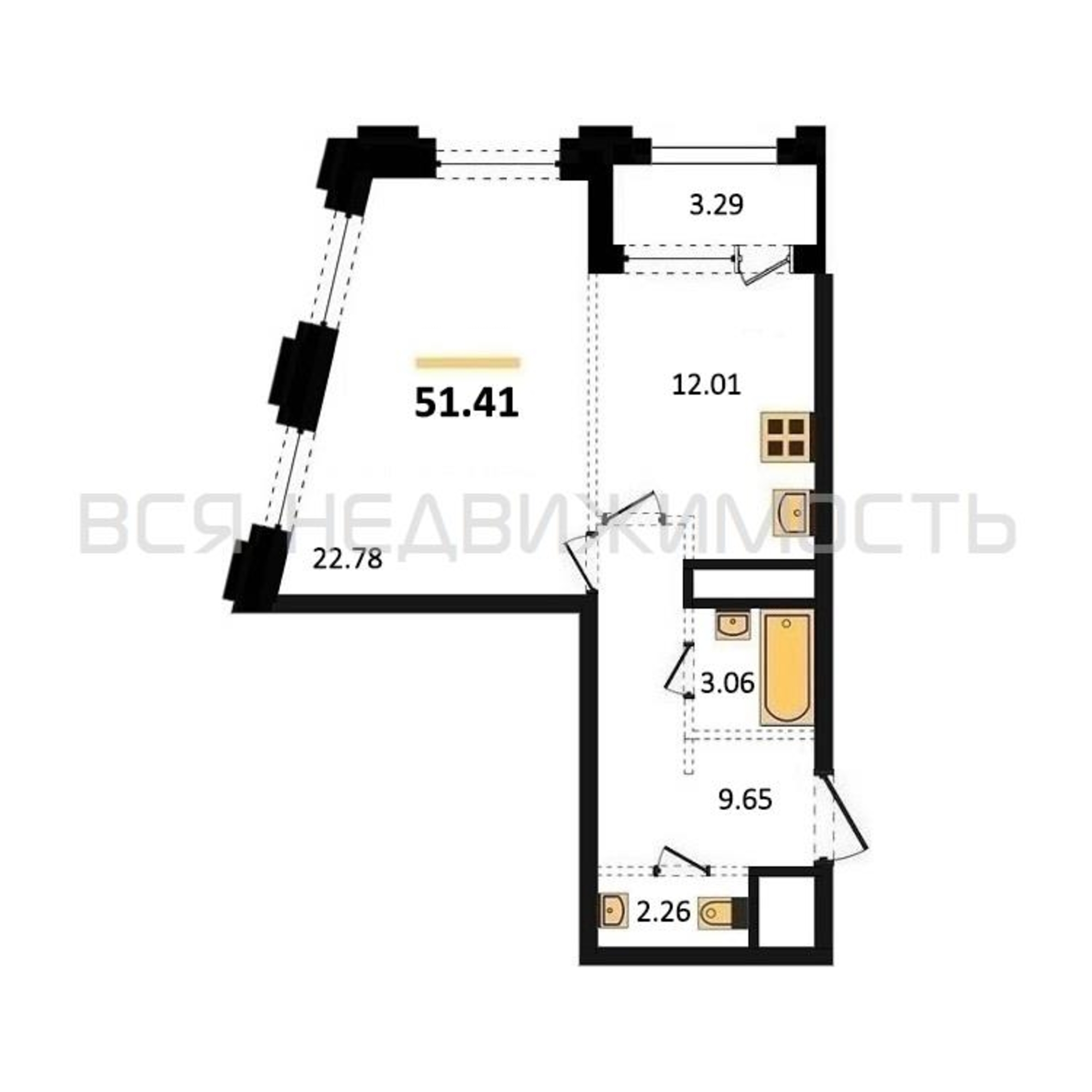 1-комнатная квартира, 51.41 м² 3/17 этаж ID объекта 100102195